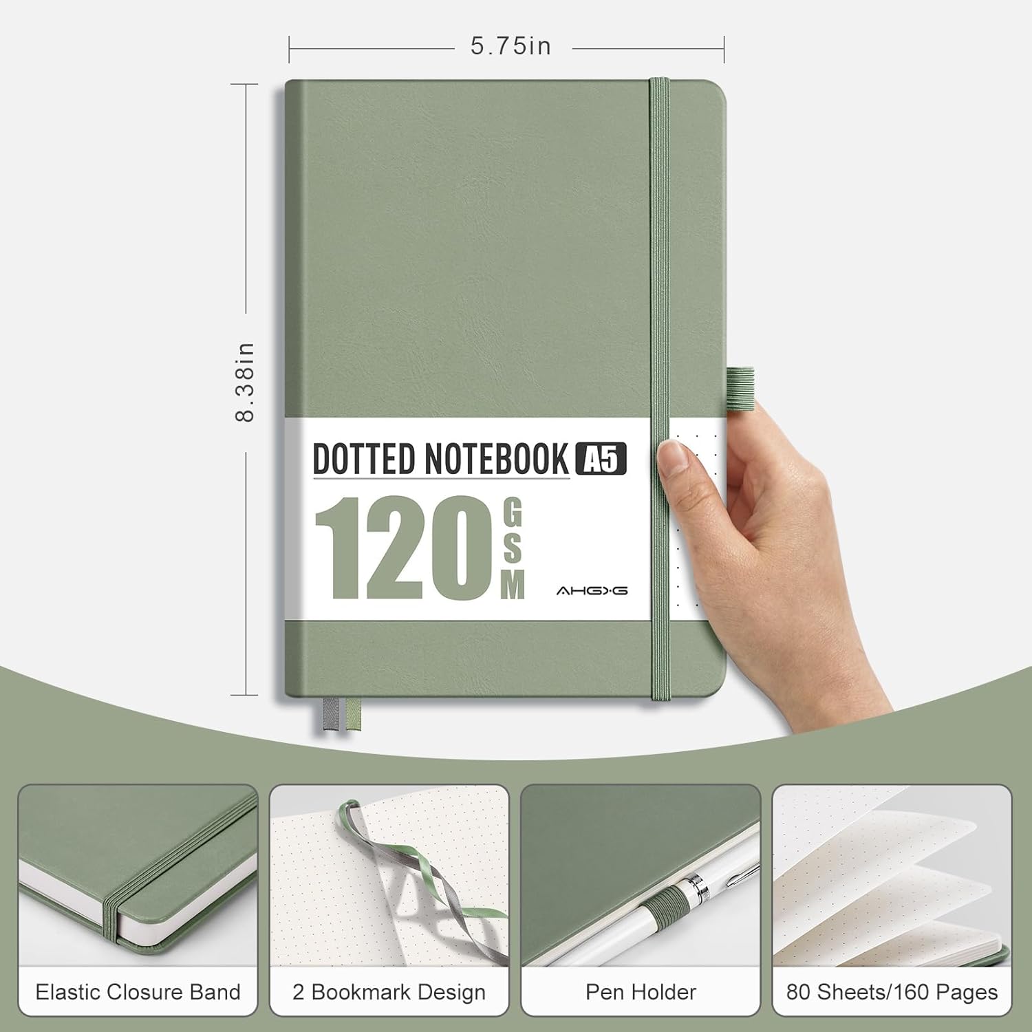 - BULLET DOTTED JOURNAL: AHGXG bullet dotted journal features 80 sheets/160 pages, providing ample space for writing. The A5 size 5.7" × 8.3" makes it easy to carry. Crafted with a durable and waterproof vegan leather hardcover, it ensures your journal stay protected in any environment