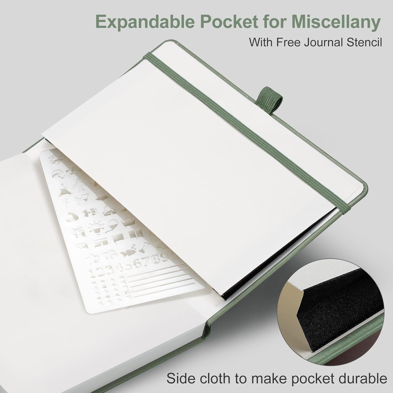 - CONVENIENT AND PRACTICAL LAYOUT: Features a pen holder for easy access to your pen, an elastic band to keep your notebook securely closed, 2 bookmarks for quick page referencing, an inner pocket for storing loose papers, and 2pcs journal stencils for additional creativity