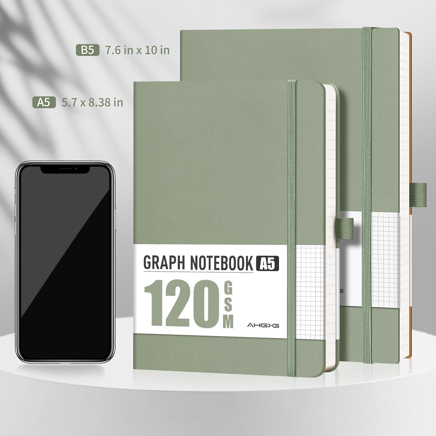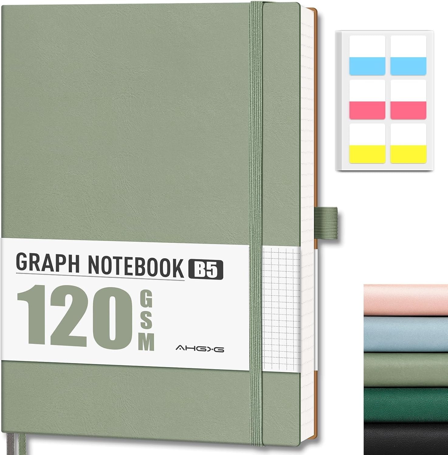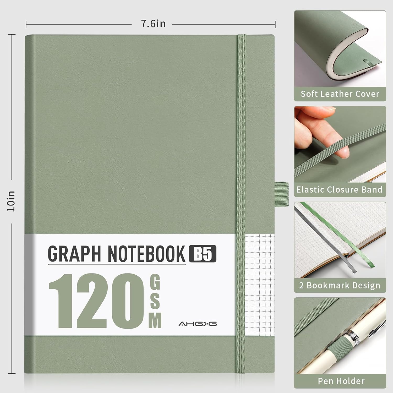 AHGXG Graph Paper Notebook - Grid Notebook Journal, 120 GSM Thick Graph Paper, Large B5 Notebook 96 Pages, Leather Softcover, for Graphing, Writing, Math, Engineering, 7.6'' X 10'' - Sage Green