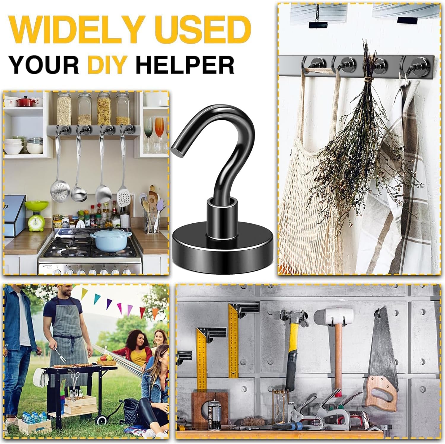 - 【Versatile Use】Super strong neodymium 80 lb magnets with hooks are perfect for hanging grill tools, decorative lights and tool accessories, also be widely used in cruise, fridge, kitchen, workplace office, garage, indoor, outdoor and anywhere there is iron or steel. No drilling holes, No sticky residue, No bolt or screws; Easy to install or remove and reusable.
