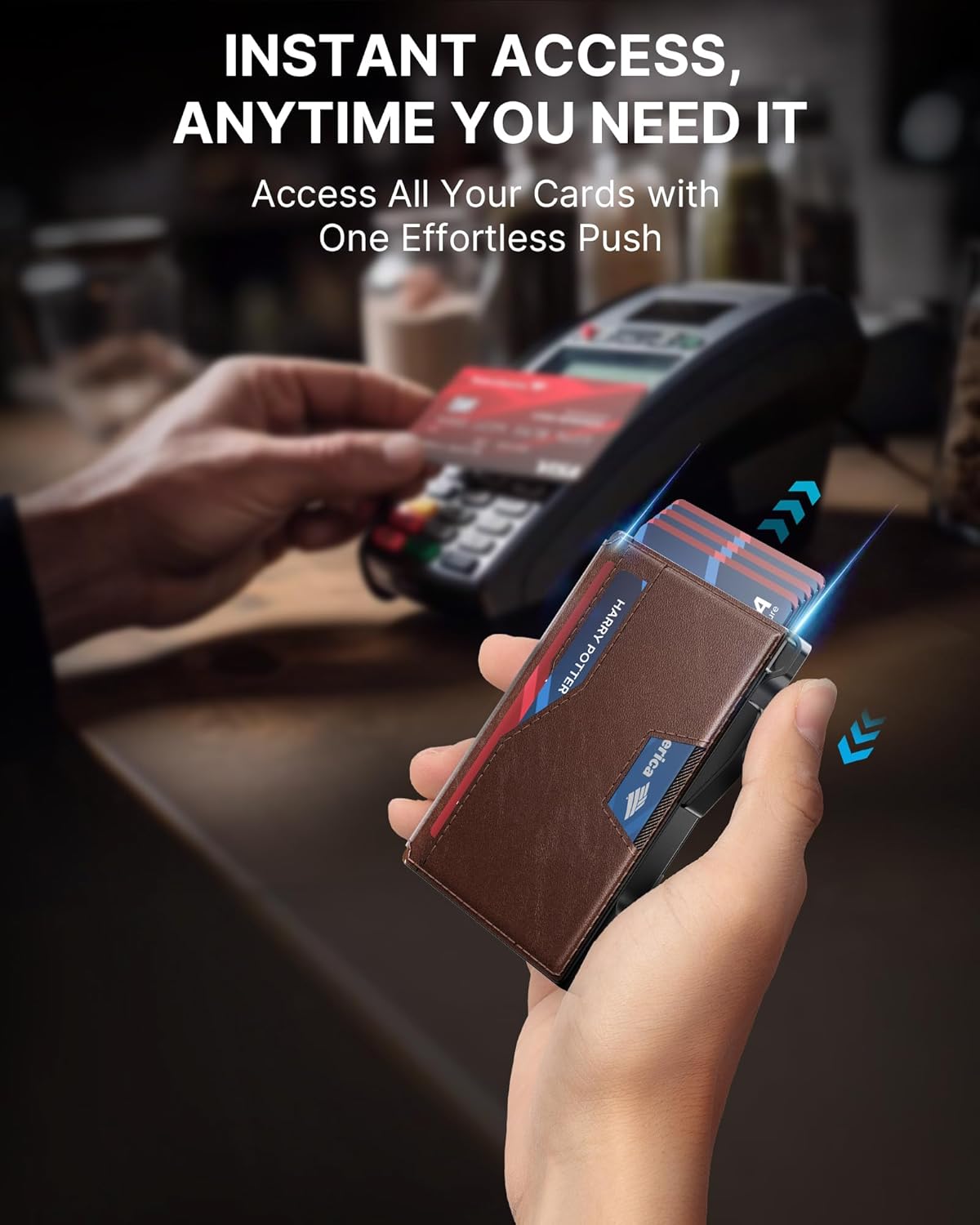 - Quick Card Access: Designed for speed, this wallet's smart pop up mechanism allows you to instantly view and select your cards. The front and back pocket provide 3 quick-release option for your frequently used card, ensuring they're always within reach.