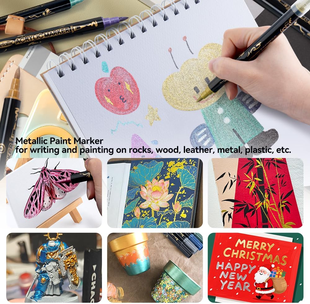 - Introducing our new metallic acrylic paint pen set, designed to inspire your creativity and elevate your art projects to the next level! With 12 metallic vibrant colors to choose from, this set is perfect for artists and crafters who want to add a pop of color to their work. These popular and vivid colors will bring your artwork to life and make your ideas stand out.