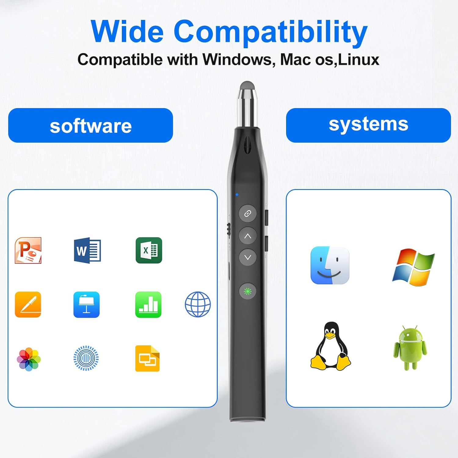 - [Easy to Use]No drivers required. Just plug into the USB dongle,then start clicking. Supports systems: Windows 2003, XP, Vista, 7, 8, 10, Mac OS, Linux; supports softwares: Keynote, Google Slides, MS Word, Excel, PowerPoint, Website, PDF.It can also be used as a promethean board pen effectively point out key information when presenting or teaching.