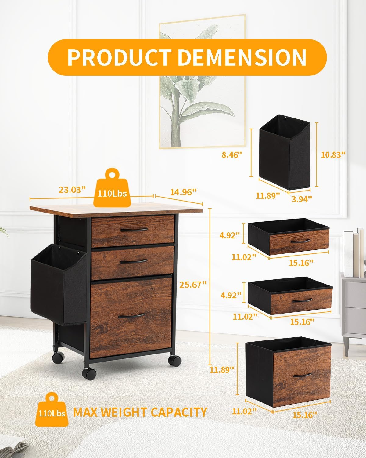 - 【Effortless Mobility】Rolling on 4 wheels, this mobile file cabinet can fix or move around your home office freely. Built-in brakes on front 2 casters to keep it in position and add stability. The unique fabric drawer design makes it light to move.