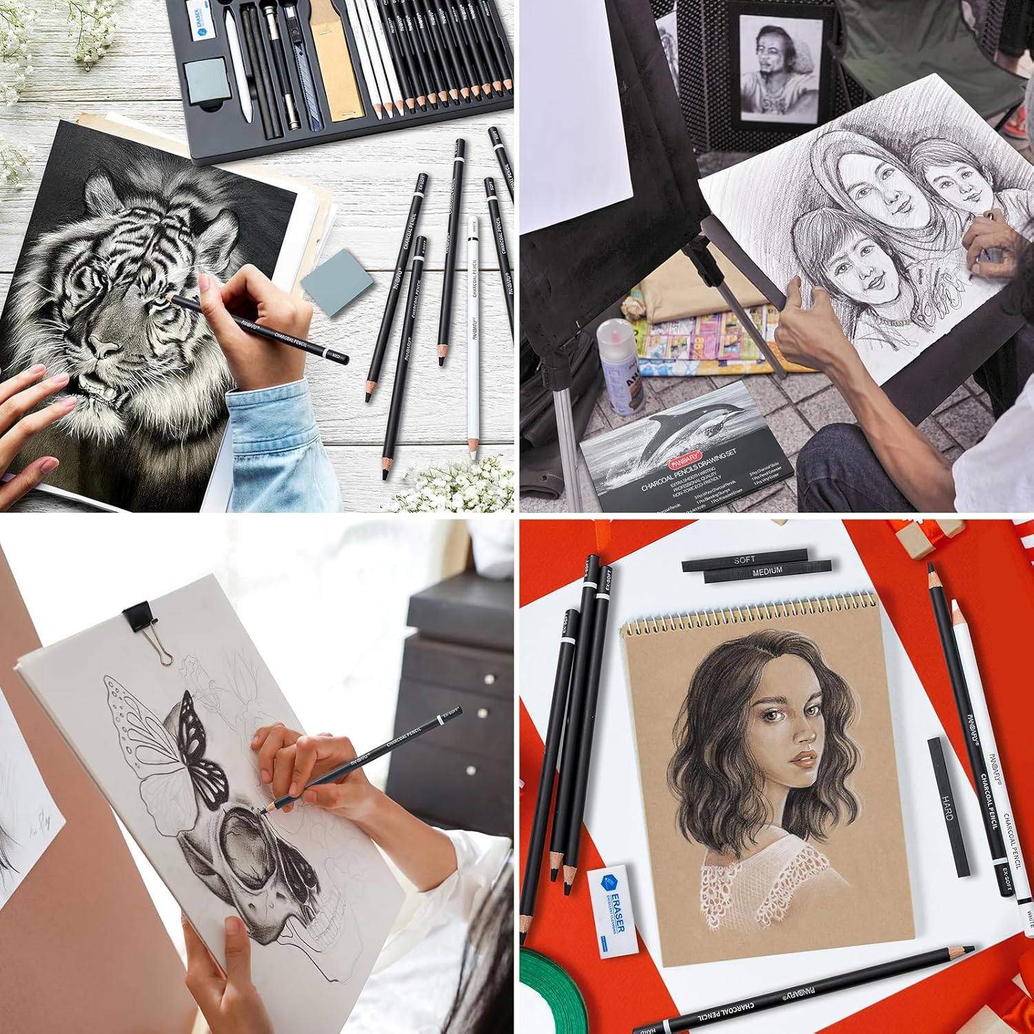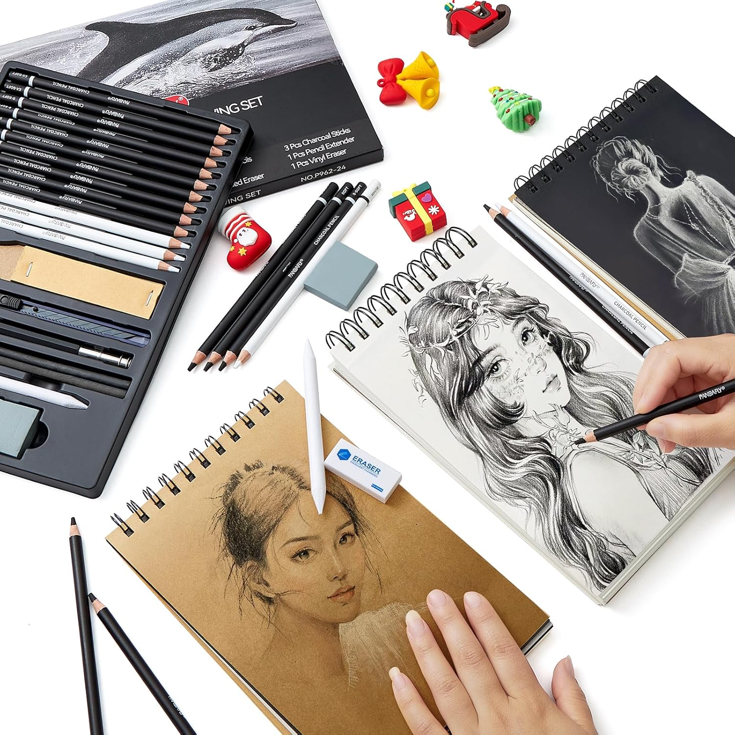 - EXTRA SKETCHING SUPPLIES KIT: 3 charcoal sticks, 2 willow charcoal sticks,1 blending stumps, 1 art knife, 1 sandpaper block, 1 pencil extender,1 kneaded eraser and 1 vinyl eraser. These extras are essential for artists and beginners