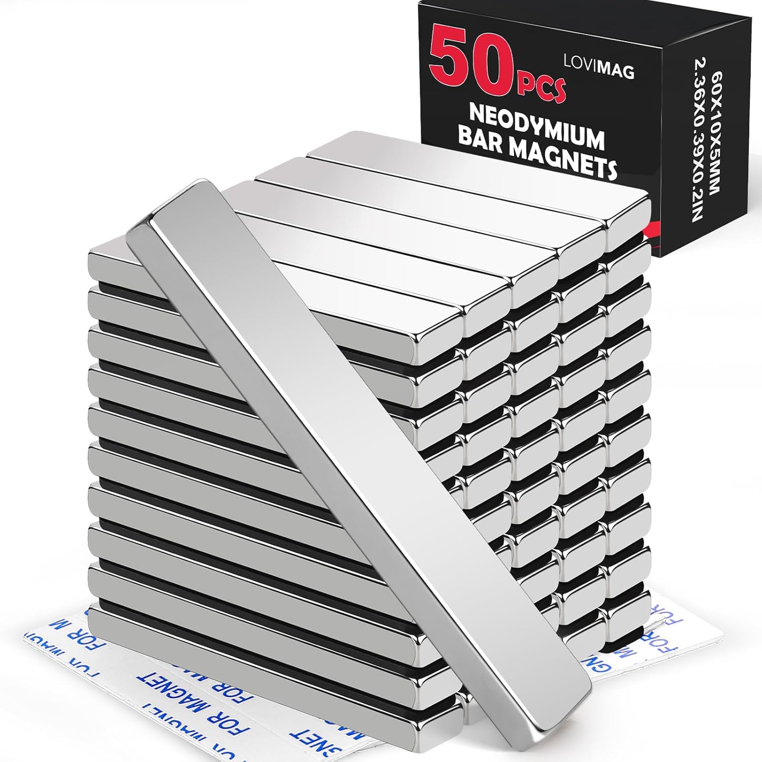 LOVIMAG Waterproof Strong Neodymium Bar Magnets, Refrigerator Magnets with Double- Sided Adhesive, Heavy Duty Magnet for Shower Door,Fridge,Office,Scientific Etc, 60 x 10 x 5 mm, Pack of 50