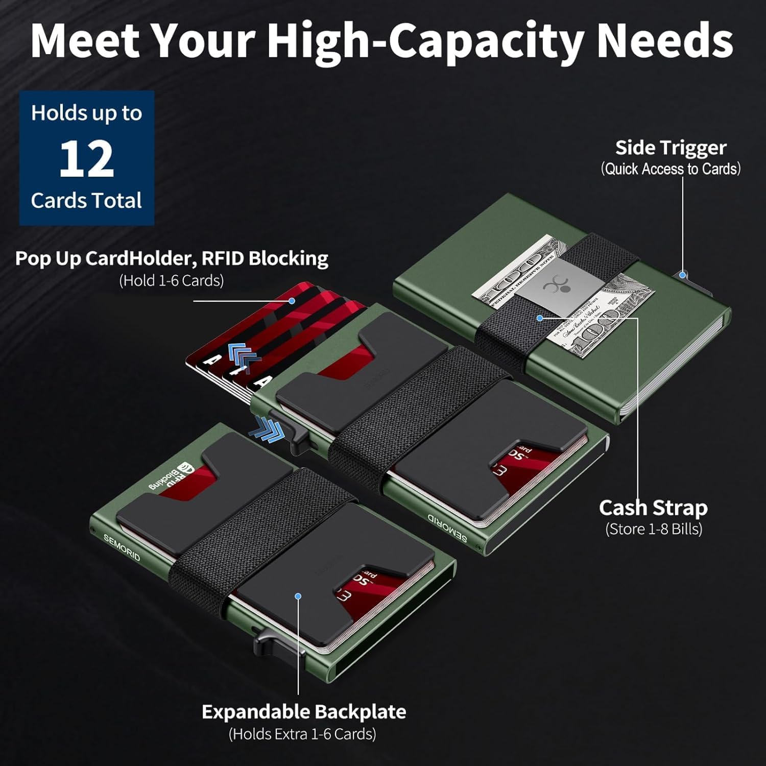 - π³ QUICK ACCESS & LARGE CAPACITY HOLD UP 1-12 CARDS: Designed with enhanced enjection mechanism button to pop up cards quickly. The aluminum cardholder holds 4-6, depends on the number of embossed cards, and the expandable metal backplate holds 5-6 additional cards. The actual capacity depends on the card thickness.