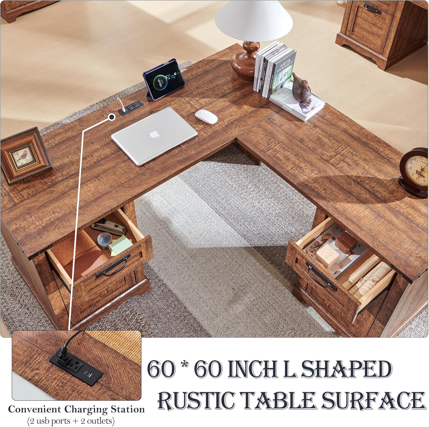 RedLemon 60" Farmhouse L Shaped Executive Desk with Drawers, Wood Home Office Corner Desk with Charging Station, File Drawer, Storage Cabinet, Rustic Computer Writing Desk (Reclaimed Barnwood)