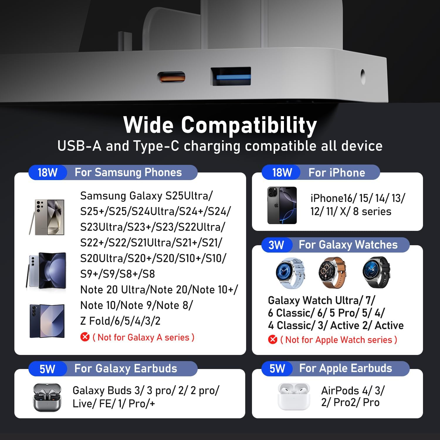 - ăWidly CompatibilityăOur charging station works for almost all samsung android and iphone that support wireless charging (NOT FOR Galaxy A and Flip Series). Such as S25 Ultra/S25/S24 Ulta/S23/S22/S21/S20/Note20/10/9/8/7, Z Fold 7/6/5/4/3/2, iPhone 16/16e/16 Plus/16 Pro/16 Pro Max/iPhone 15/15 Plus/15 Pro/15 Pro Max/iPhone 14/14 Pro Max/14 Plus/14 Pro/iPhone 13/13 Pro/13 Pro Max/13 Mini/12/12 Pro/12 Pro Max/12 Mini/11/11 Pro/11 Pro Max/SE/XS MAX/X/XR/8/8 Plus