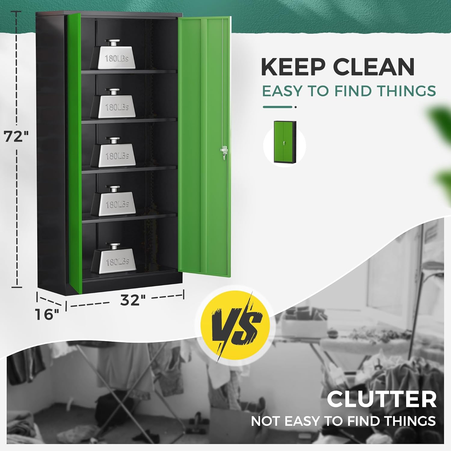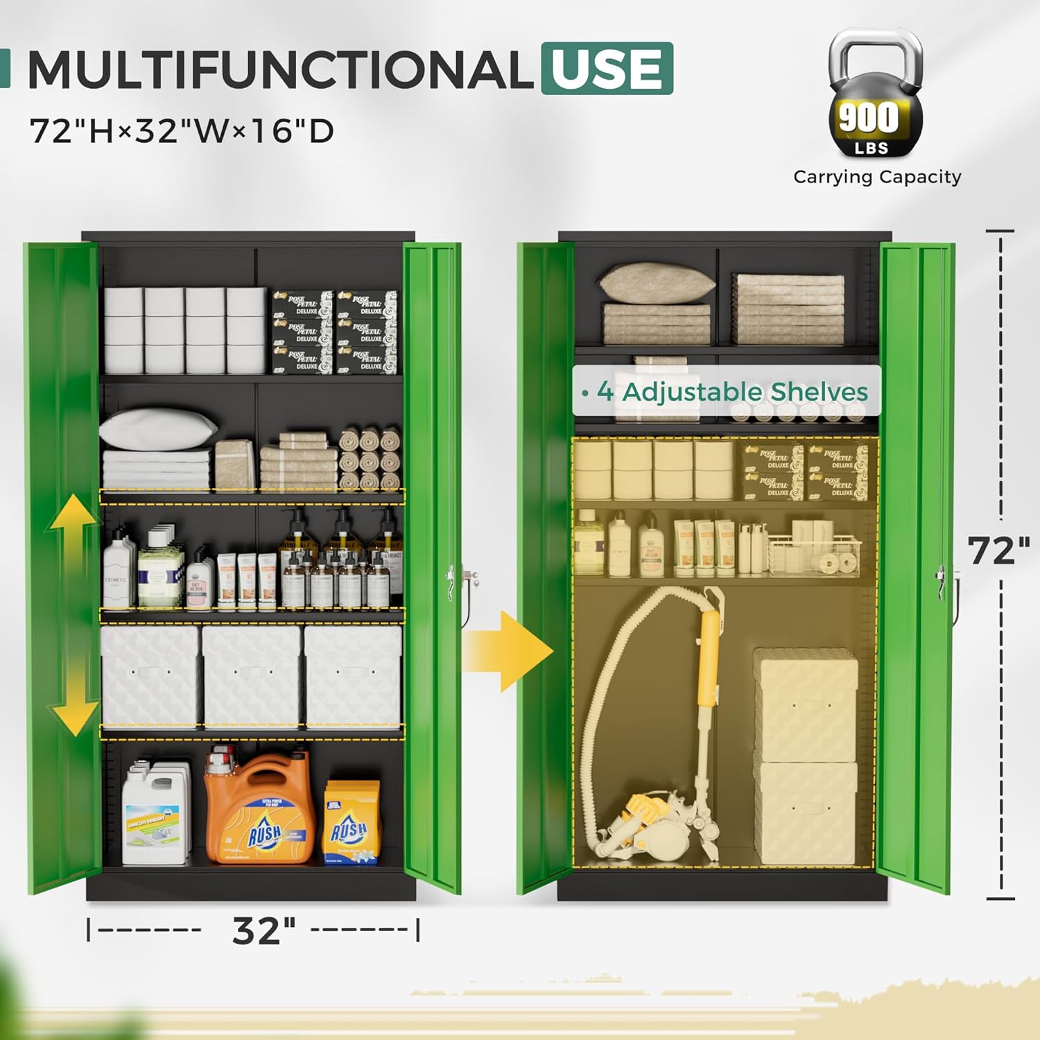 - [Big Size & Large Storage]:Greenvelly (72β)steel storage cabinets have a popular size (72*32*16),and each one has four adjustable shelves inside, which can be adjusted according to the height and size of the storage goods. This lockable storage cabinet is suit for many scenes,such as garage,home,office,school,etc.
