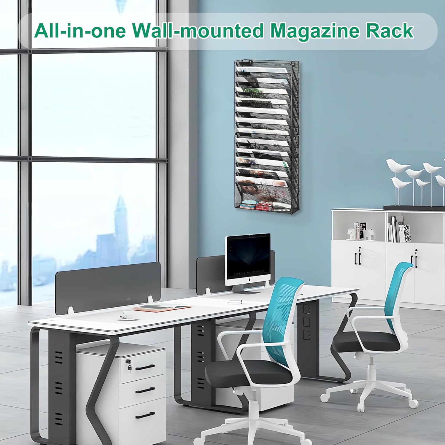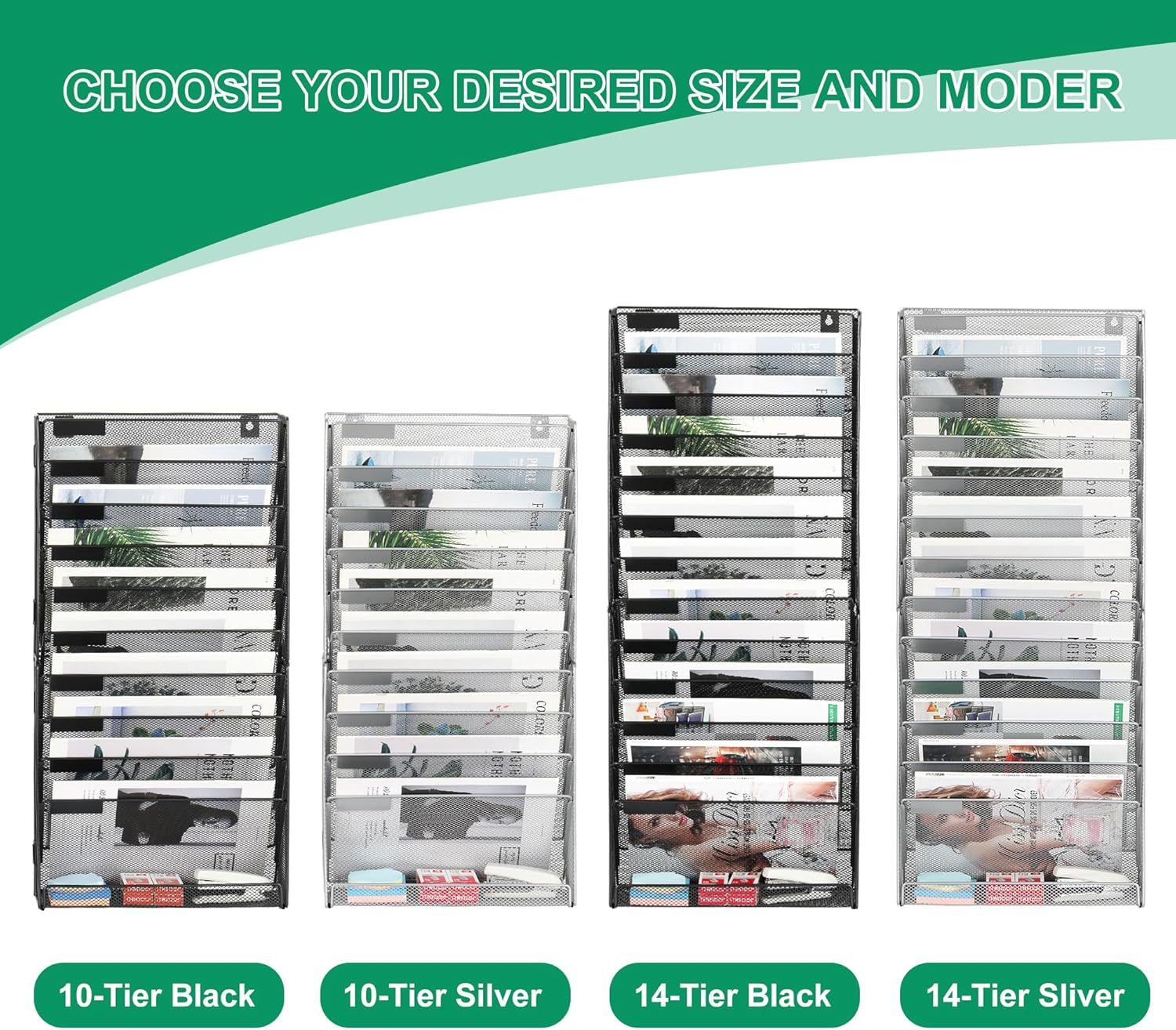 14-Tier Wall File Organizer, Hanging Mail Organizer Wall Mounted Paper Document Holder, Metal Clipboard Storage Basket for Office Home School Organization, Black
