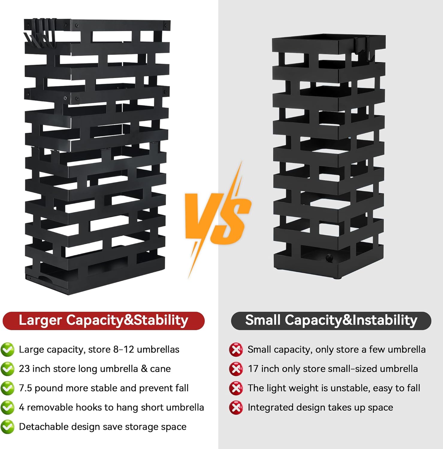 - 【Sturdy Structure】: This umbrella stand indoor made of high-quality metal with anti rust coating, suitable for outdoor use. The size of 11.8 x 5.9 x 23 inches is more stable than other small rain umbrella stand.A weight of 7.5 pounds can prevent it from tipping over.