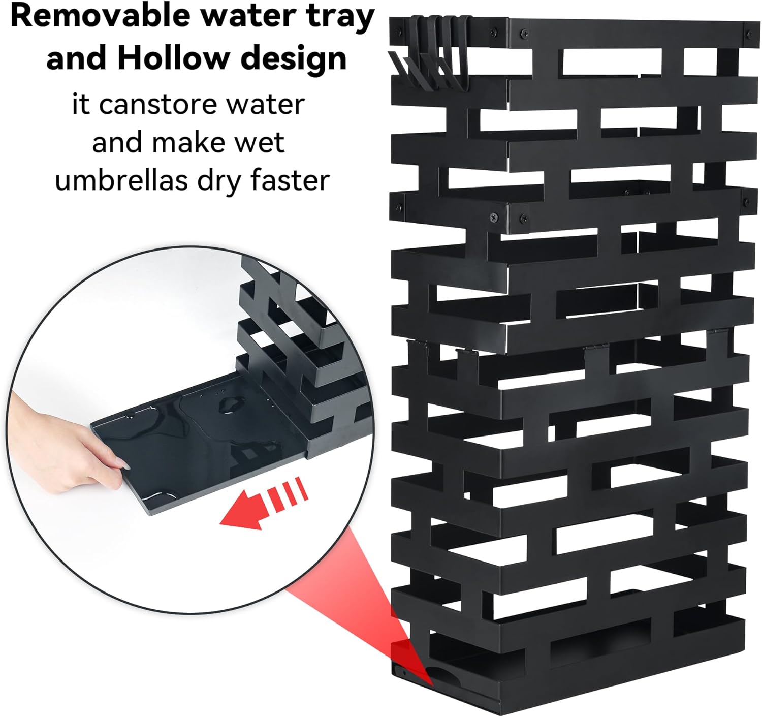 - 【Detachable Tray & Hook】: This umbrella rack is equipped with a detachable water tray, which can effectively collect raindrops and is easy to clean, keeping your floor dry even on rainy days. 4 hooks for convenient hanging of foldable umbrellas.