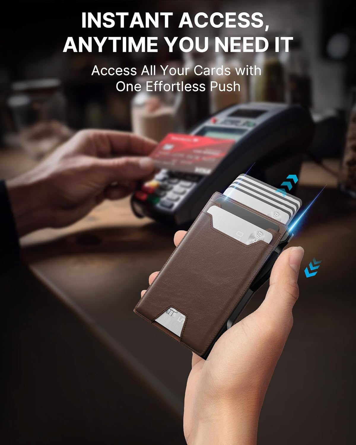 - Quick Card Access: Designed for speed, this wallet's smart pop up mechanism allows you to instantly view and select your cards. The front and back pocket provide 3 quick-release option for your frequently used card, ensuring they're always within reach.