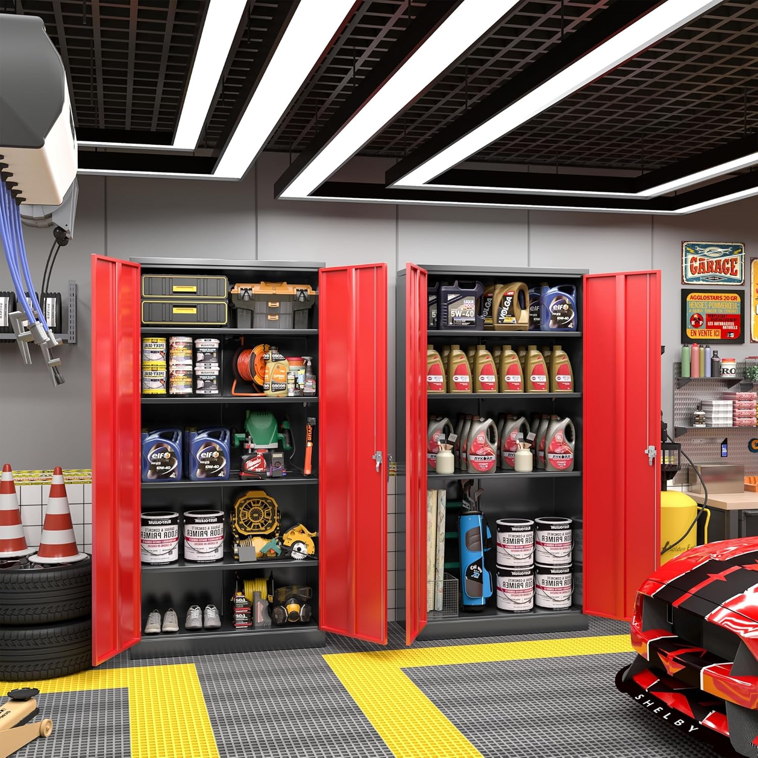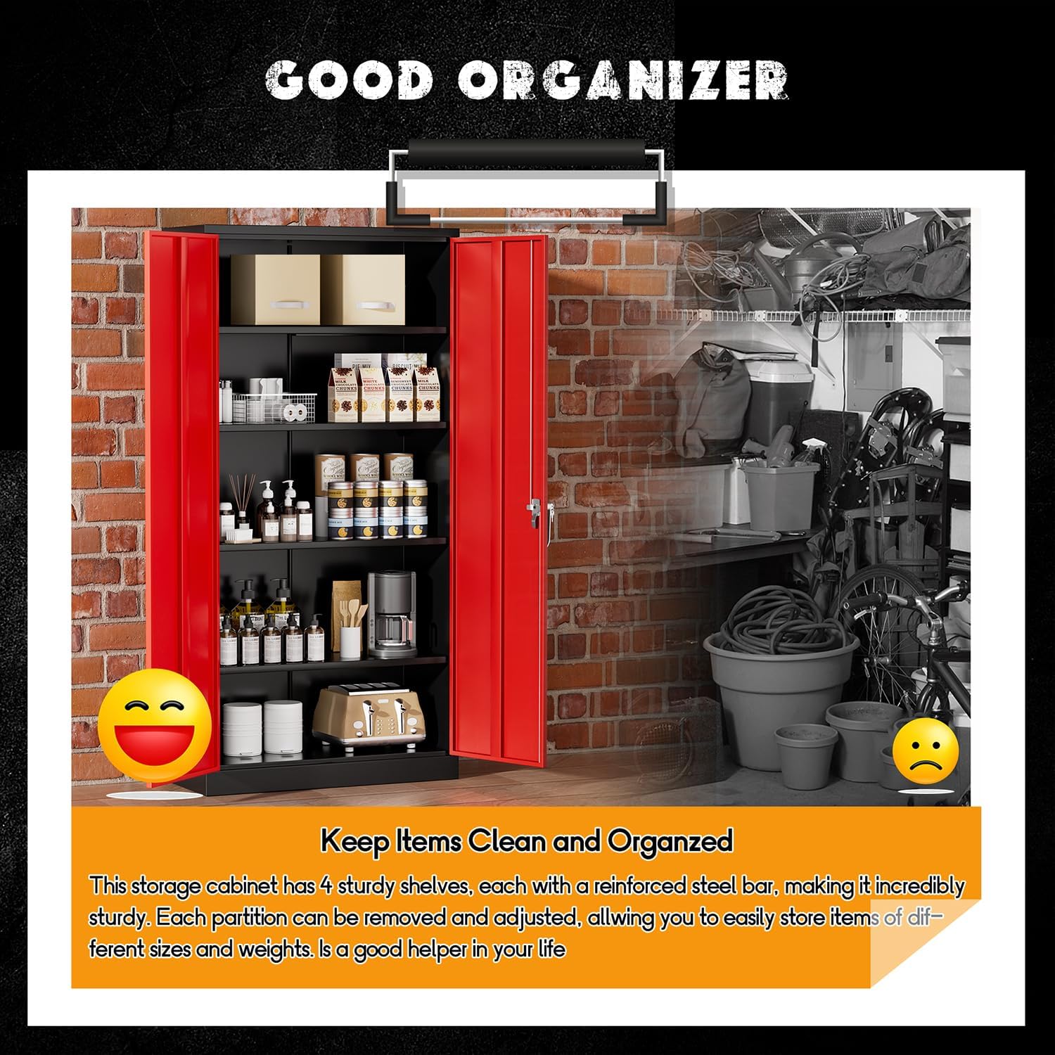 Greenvelly Metal Garage Storage Cabinet with Lock, 72" Metal Storage Cabinet with 2Doors and 4Adjustable Shelves, for Home Office, School,Gym (Black&Red)