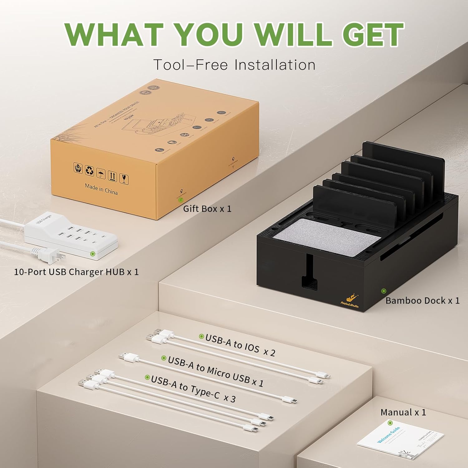 - What You Can Get: 1 x Pezin & Hulin Bamboo Charging Station, 1 x 10-Port USB Charger HUB & Cord, 6 x Short USB Cables (3pc Type-C, 2pc for lPhone & lPad, 1pc Android) for your daily use, 1 x user manual