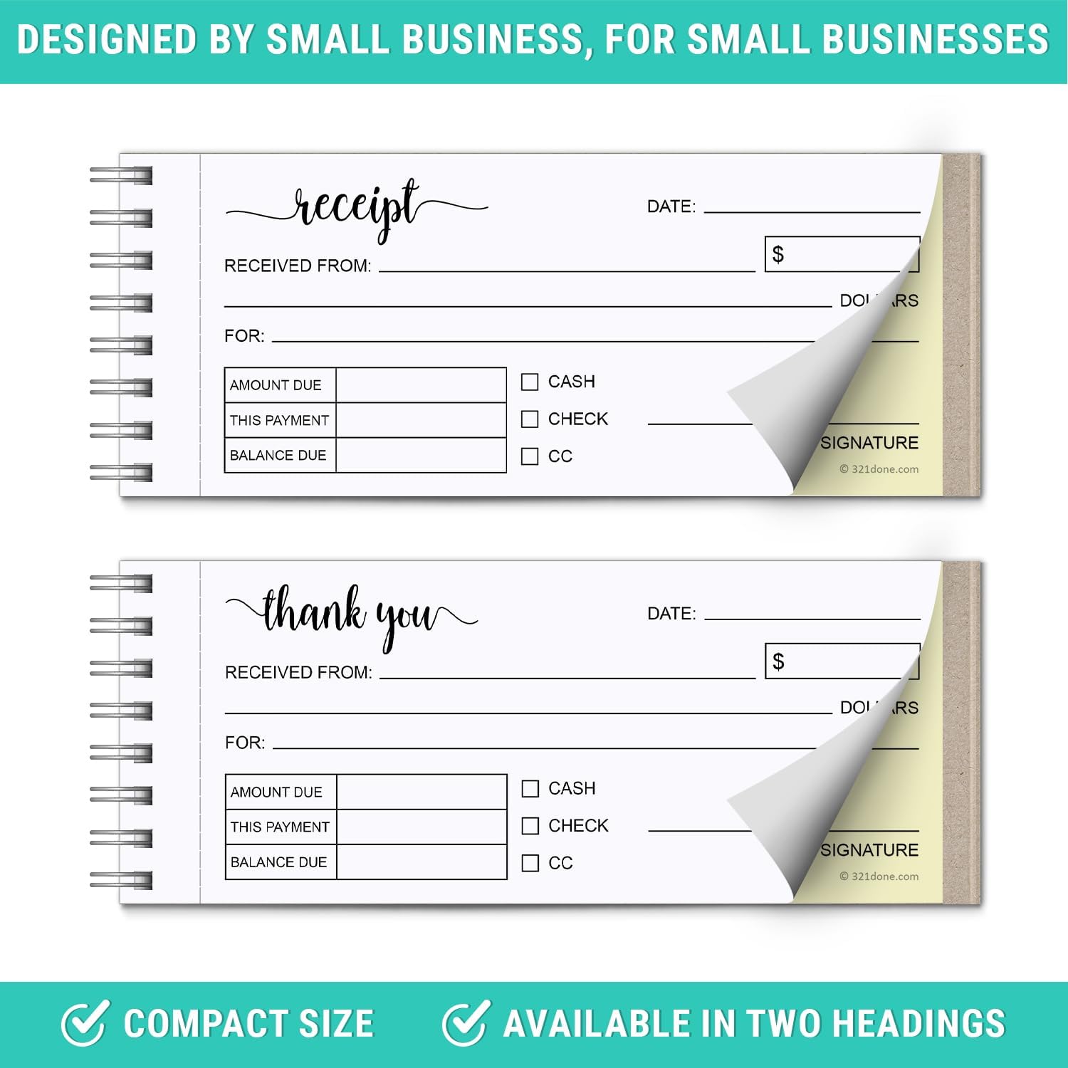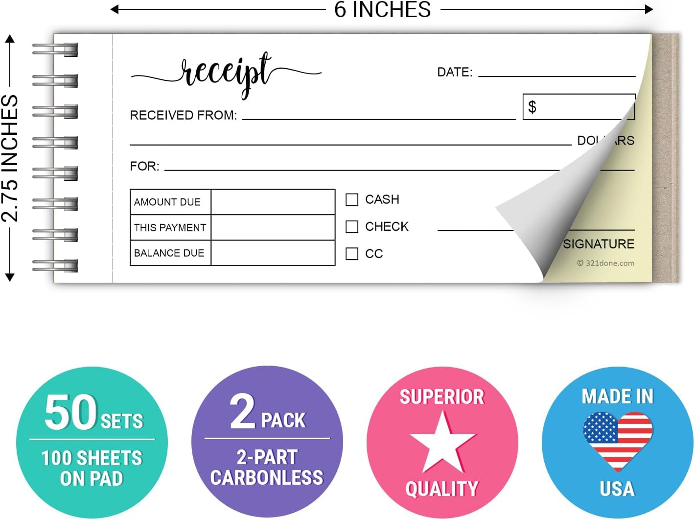 321Done 2-Pack Spiral Receipt Book, Made in USA - 2-Part Carbonless Spiral Bound 2.75x6, Receipt Book with Carbon Copies for Small Business - 100 White/Yellow Sets