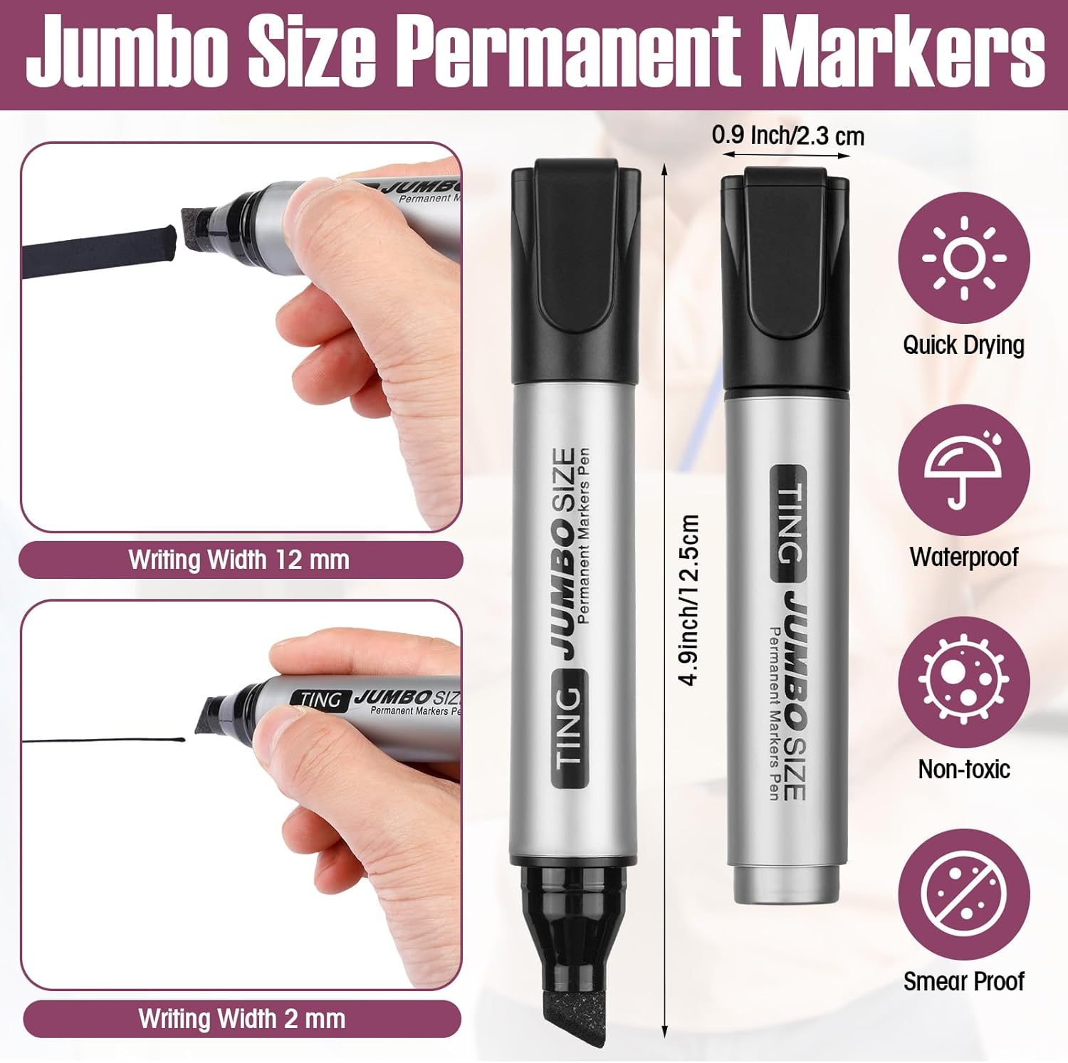 - Jumbo Size: a more substantial size means more ink and a longer lifespan; Measuring 4.9 x 0.9 inches / 12.5 x 2.3 cm, these big markers will last longer than the regular; They ensure fluid lines, suitable for creating crisp images or clear words