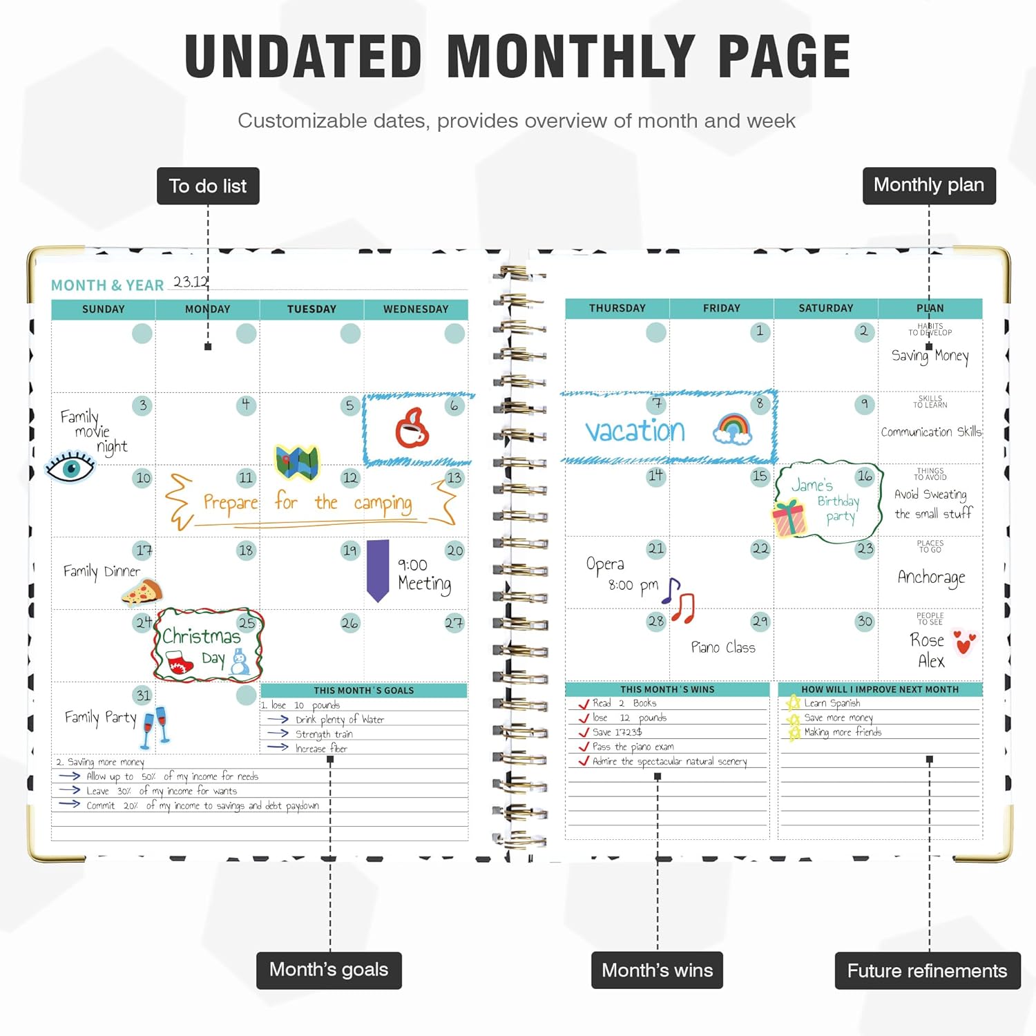 - Undated Clear Layout: With 12 blank months and 53 weeks, a 7 AM to 8 PM daily schedule section, and additional sections for contacts, passwords, awareness and self-discovery, daily rituals, goals, and notes, this life planner offers the freedom to plan your schedules at any time.