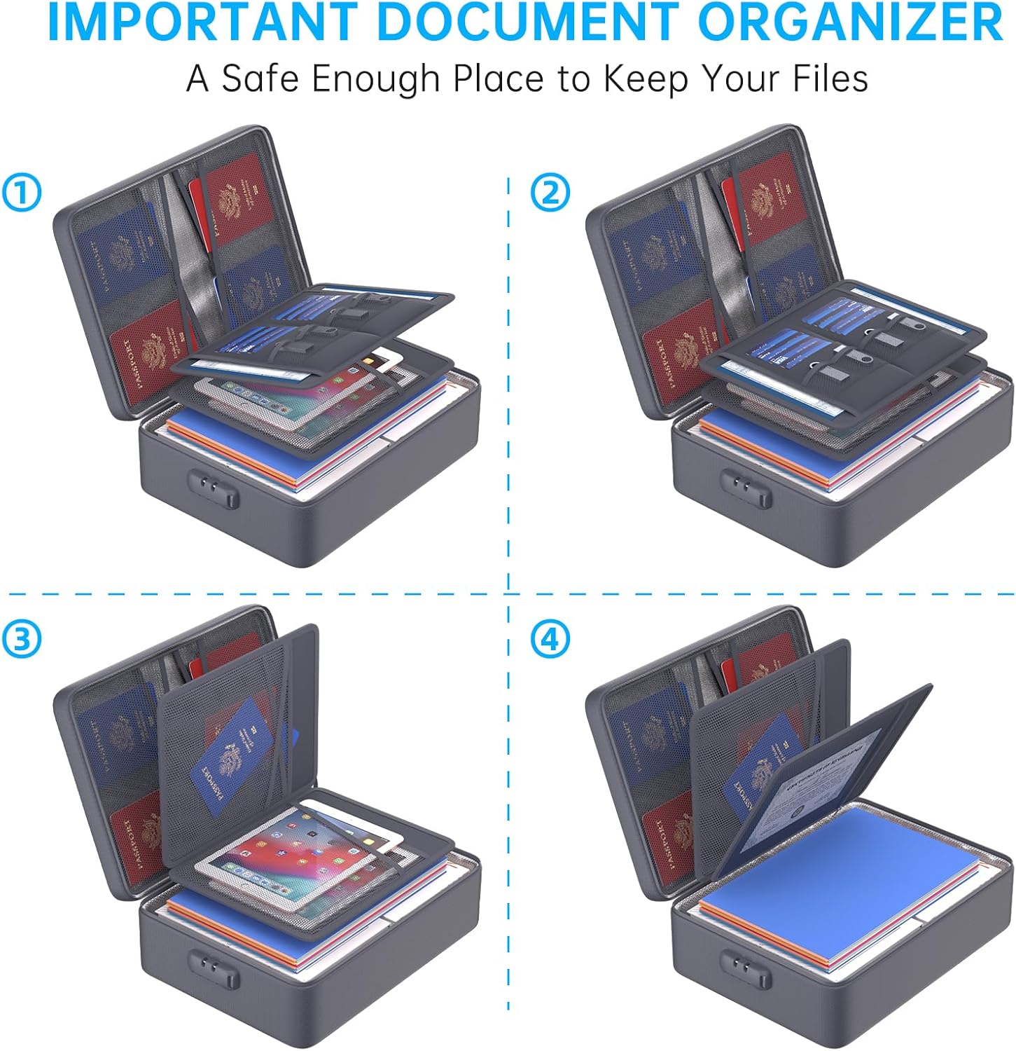 - Combination Lock Protection: Compared with other bags,our 5200°F fireproof document organizer bag can lock files and items inside the bag for safety. High-quality password lock provides maximum security for your valuables such as contracts, cards, certificates, conference materials, passports, etc. The package includes an instruction manual for lock(No keys required).Fireproof bag for files is sealed with professional waterproof zippers that can withstand high speed spray of fire hose.