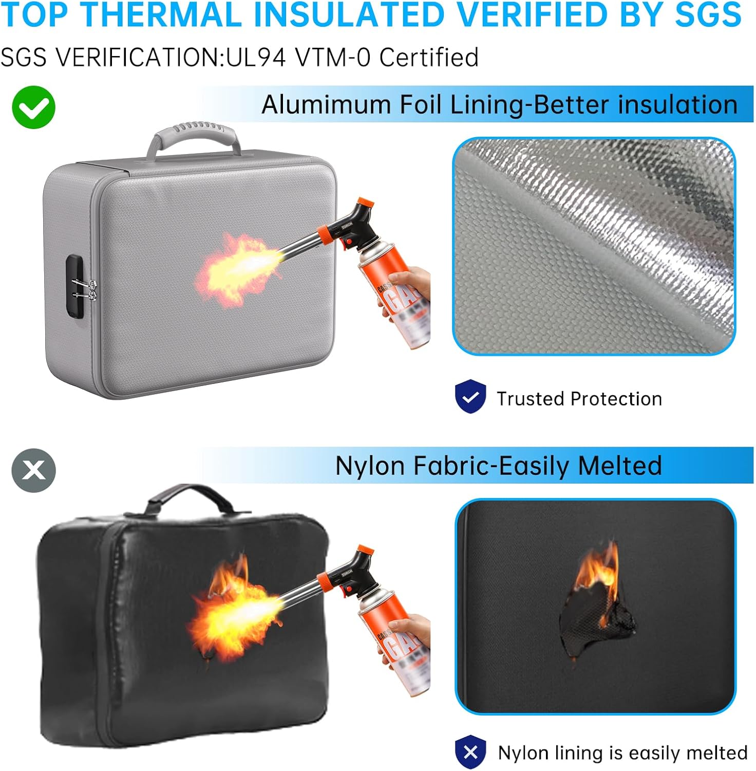 - 5200°F Fireproof & Water-resistant: The Upgraded Fireproof Document Bag is made of silicone coated material and aluminum foil which withstand the temperature up to 5200℉(double safe protection).Aluminum foil lining isn’t easily melt under high temperature after several tests. It has been passed by SGS TEST(UL94 VTM-0 Certified).The bag is fireproof&Water-resistant, which can effectively protect your important documents in a fire, flood, and wet weather. They will further keep your files intact.