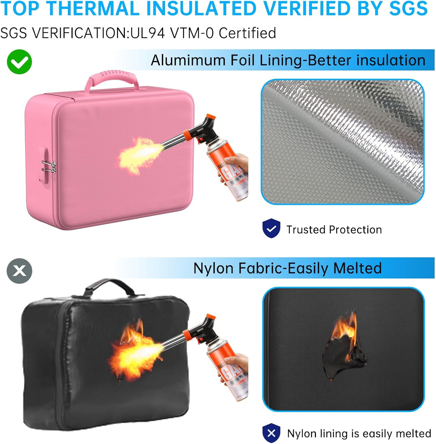 ENGPOW 5200°F Fireproof Document Bag with Lock, Upgraded Heat Insulated Fireproof&Waterproof Box 8 Layers Document Organizer, Portable Home Travel Safe Storage Box for Important Files, Laptop, Pink
