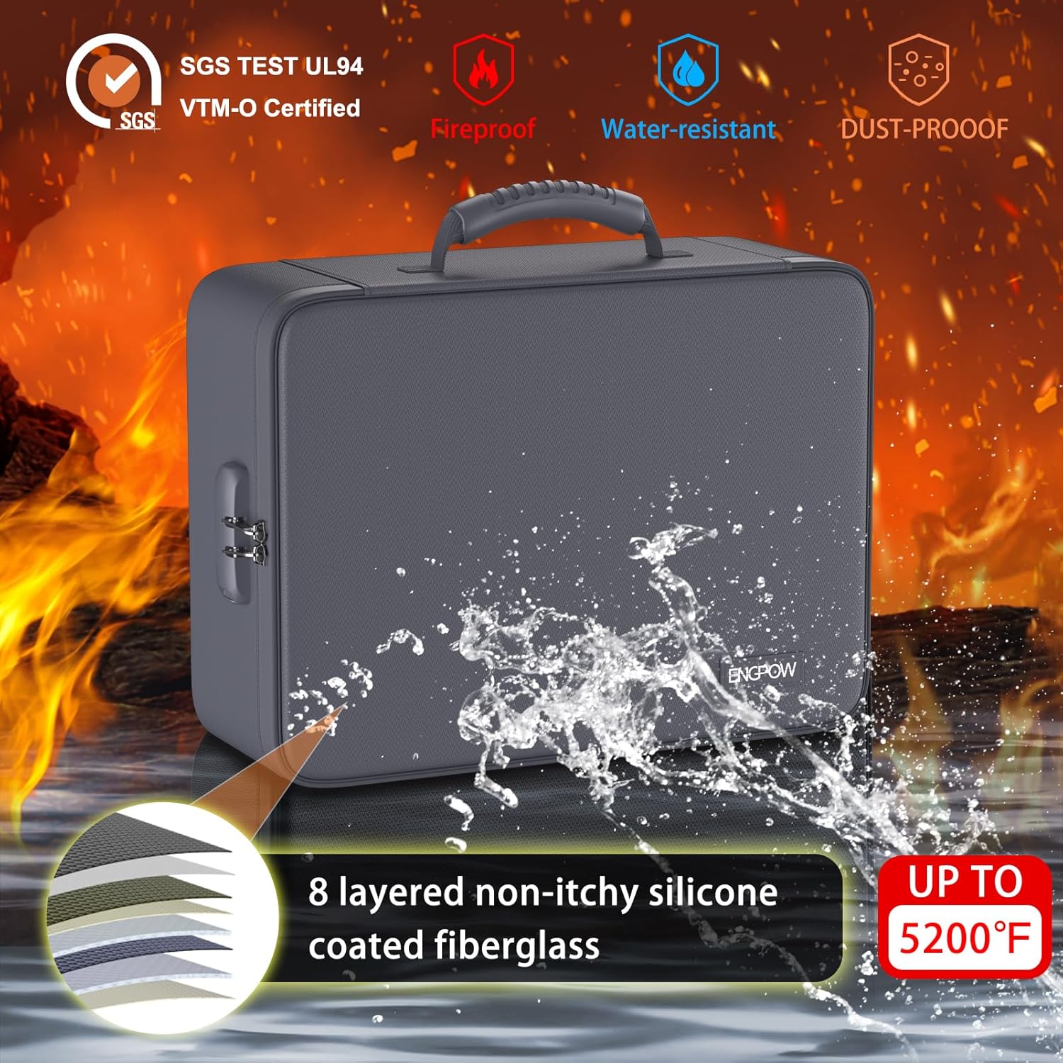 ENGPOW 5200℉ Fireproof File Organizer Bag with 13 Pocket Accordion File Folder,Document Organizer Box with Lock&Labels,Multi-Layer Portable Home Travel Safe Storage Box for Important Documents,Gray
