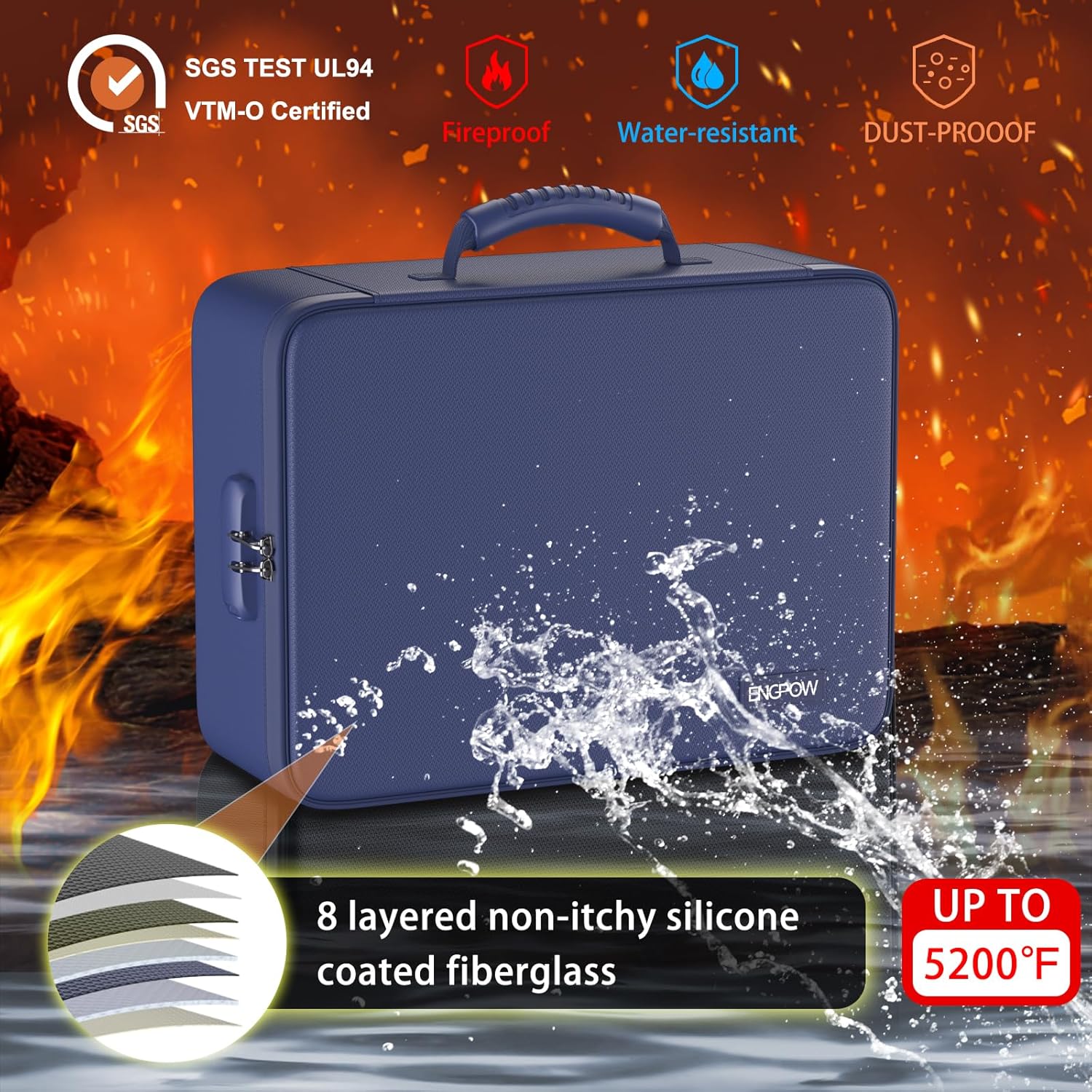 - Fireproof and Water-resistant: The multi-Layer file organizer is made of silicone coated material and aluminum foil which withstand the temperature up to 5200℉(double safe protection).Aluminum foil lining isn’t easily melt under high temperature after several tests. It has been passed by SGS TEST(UL94 VTM-0 Certified).The bag is fireproof and Water-resistant, which can effectively protect your important documents in a fire,flood,and wet weather. They will further keep your files intact