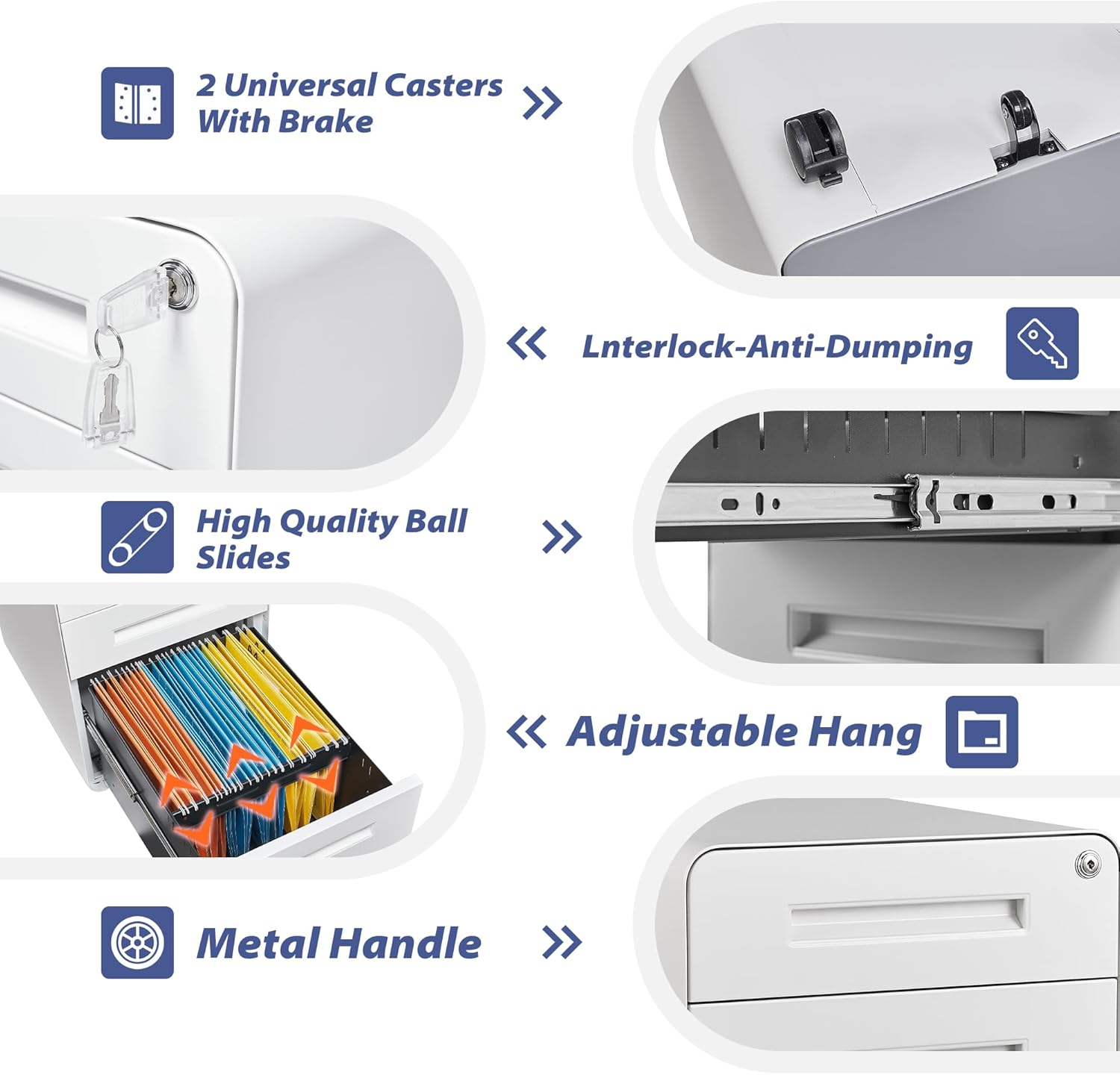 - 【Ample Storage Space - Meet Your Needs】: The white locking file cabinet with adjustable hanging rods can accommodate letter, A4, and F4 size hanging file folders, perfect for organizing your files, documents, and other office supplies. Overall dimensions are 17"D x 31.5" W x 27.5" H. Drawer dimensions are 15.7" D x 15" W x 12", providing ample storage space. Additionally, the mobile filing cabinets are designed with sturdy ball-bearing slides, allowing you to effortlessly Open and close drawers.