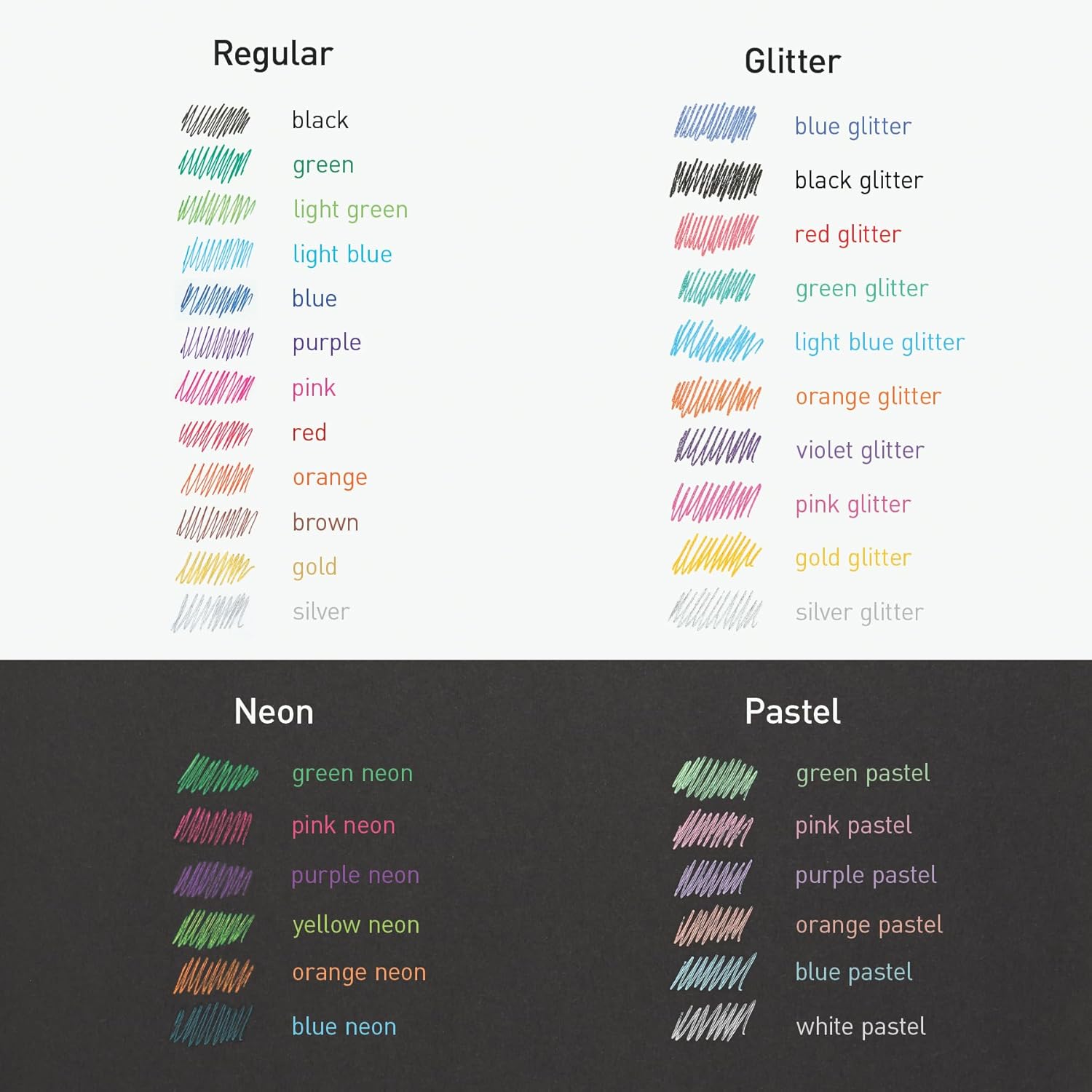- This Pentonic multicolor gel pen set comes with 36 pens in 36 different colors: classic, neon, pastel, and glitter