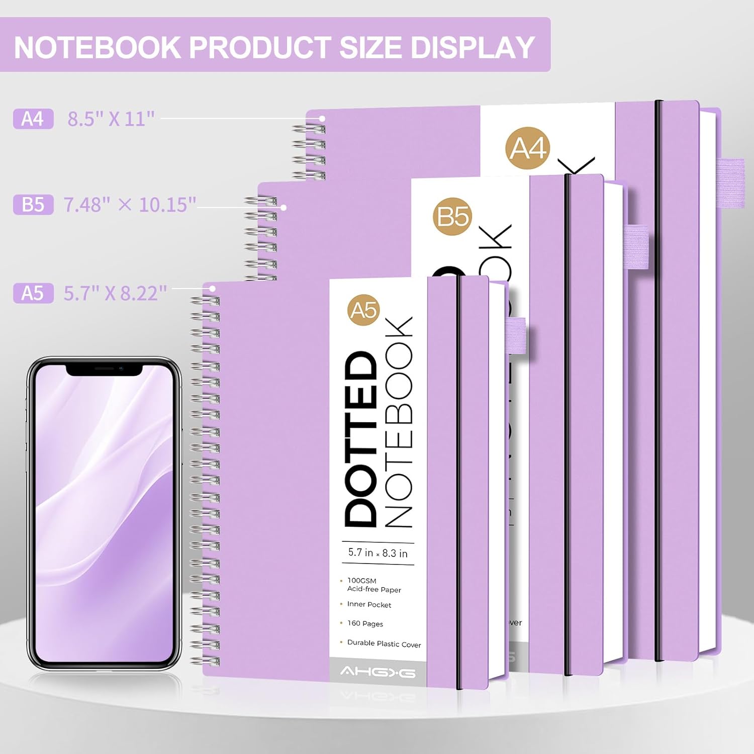 AHGXG Bullet Dotted Journal - Dot Grid Spiral Notebook 8.5" x 11", A4 Large Dotted Notebook, 100 GSM Thick Paper, Waterproof Plastic Cover Journals for Bullet Journaling, Sketching, Purple