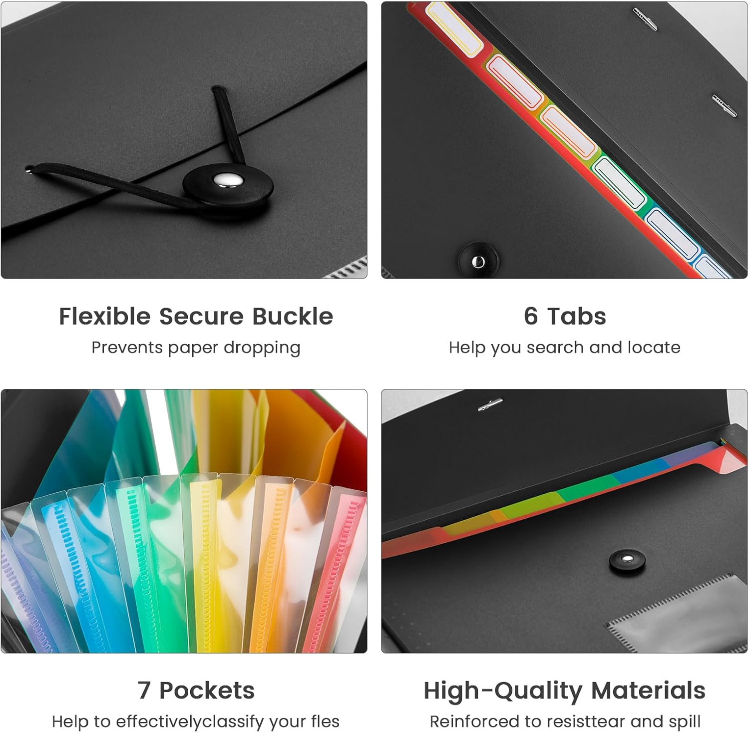 Accordion File Organizer, 7 Pockets Expanding File Folder with Labels, A4/Letter Size Portable Folders for Documents, Paper Organizer for School Office Supplies, Black