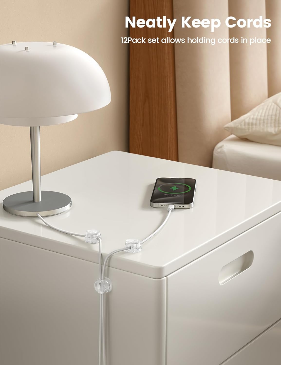 12Pack Cord Organizer [1s Lock] Spring Cable Holder Clips - Lamicall Desk Cord Management Clips, [Smooth Adjustable] Phone Charger Cable, Adhesive Wire Keeper for Nightstand Wall Car Office