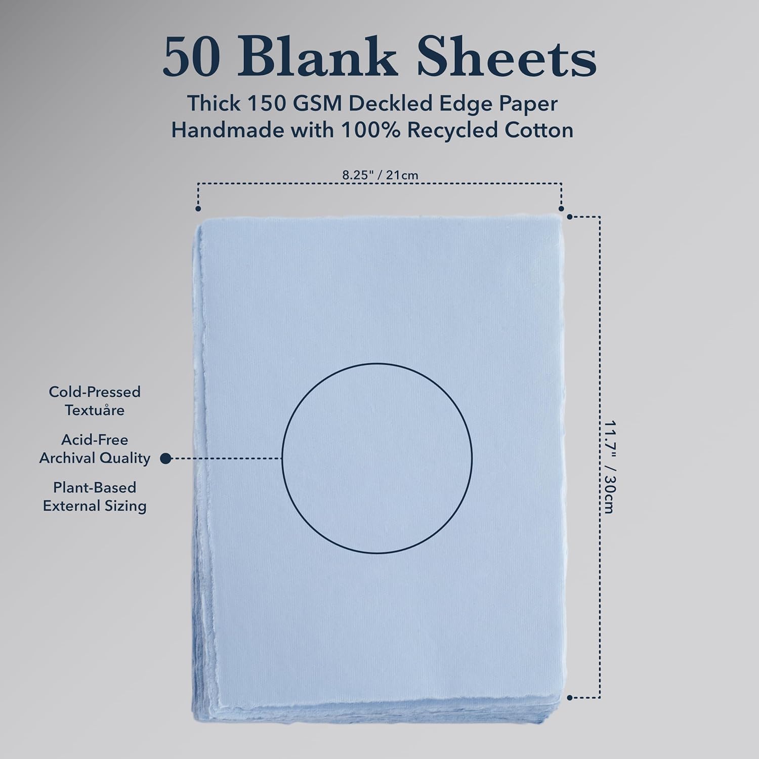 Wanderings Blue A4 Handmade Paper with Deckled Edge - 8.3" x 11.7", 150 GSM, 50 Sheets Textured Paper - Perfect for, Drawing, Writing, Printing, Watercolor & Mixed Media