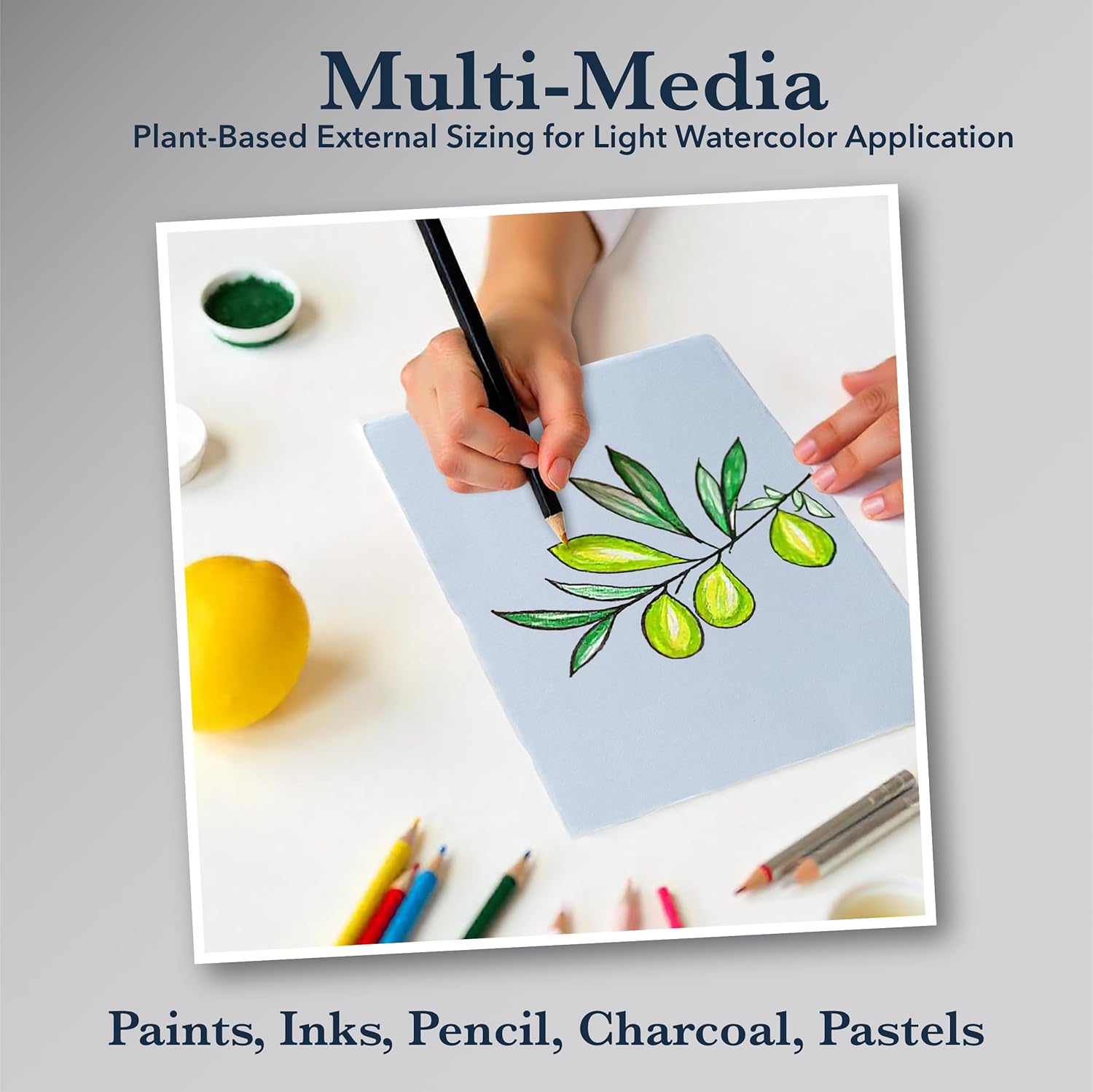 - [Artisan Crafted – Handmade Deckled Edge Cotton Paper]: Experience the unmatched craftsmanship of our 50-pack handmade cotton deckled edge paper, expertly produced by artisans using time-honored techniques passed down through generations since 14th-century India. These luxurious, cold-pressed 150gsm handmade paper sheets are externally treated with plant-based sizing solution, making it ideal for watercolor, acrylics, charcoal, ink, or pencils. For heavy washes and extensive water use, we recommend our watercolor paper: B097LLX66N
