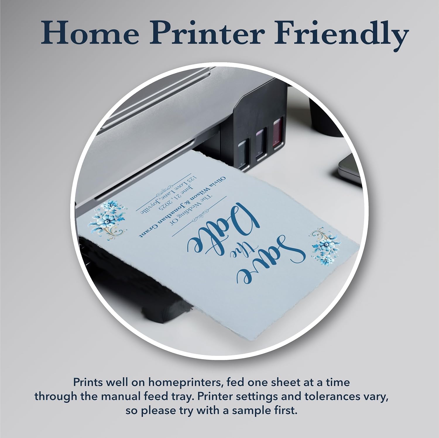 - [Home Printer Friendly – 150gsm A4 Handmade Paper]: Our cotton paper for deckled edge 150gsm paper is compatible with home printers, offering endless possibilities when used as wedding invitation paper, or for cards, menus or even books. For best results, feed one sheet at a time through the manual feed tray. As printer settings and tolerances can vary, we recommend testing with a sample first to ensure optimal print quality. 50 sheets of 8.25”x11.7” / 21x30 cm, A4 size paper