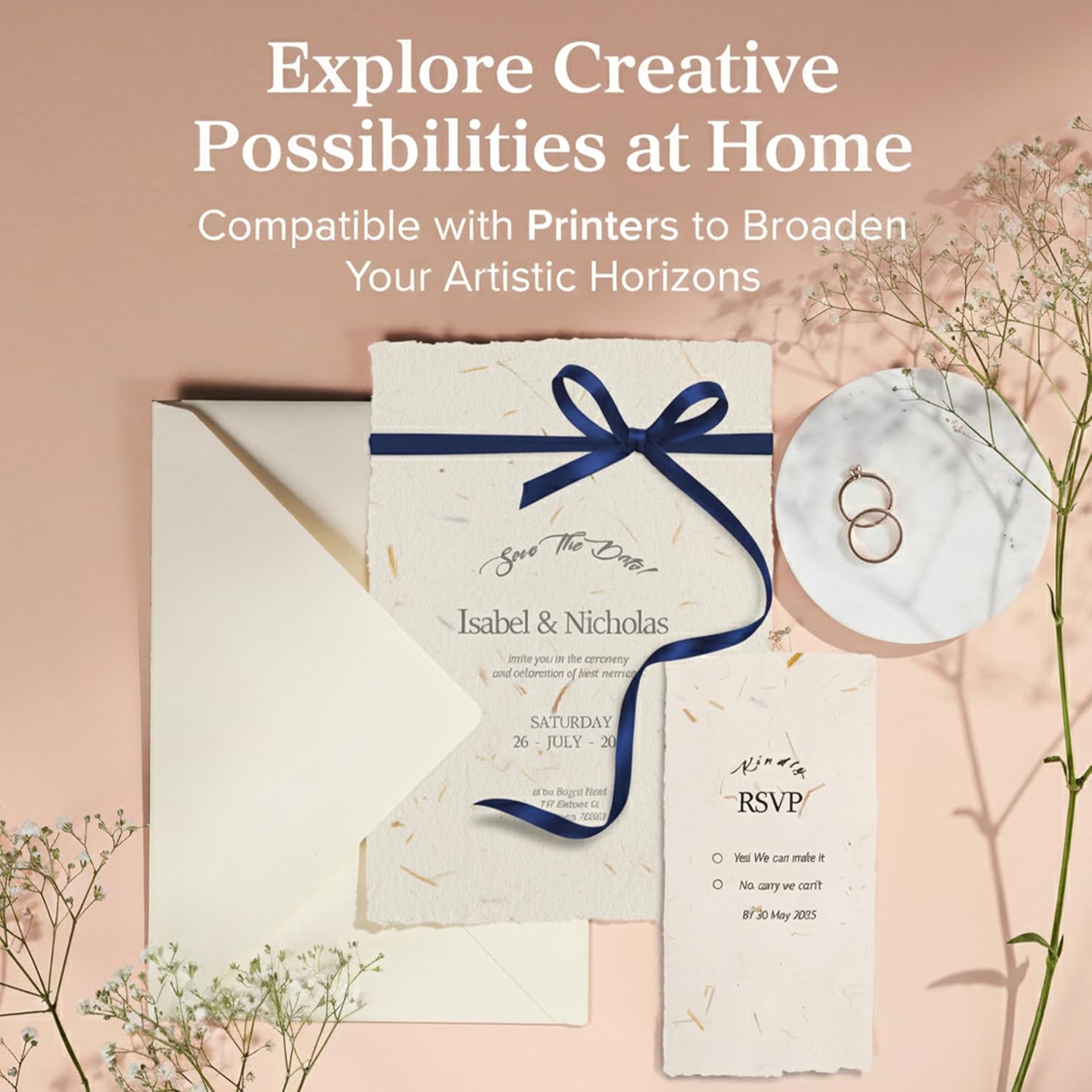 - [Home Printer Friendly]: Our cotton paper for deckled edge 150gsm paper is compatible with home printers, offering endless possibilities when used as wedding invitation paper, or for cards, menus or even books. For best results, feed one sheet at a time through the manual feed tray. As printer settings and tolerances can vary, we recommend testing with a sample first to ensure optimal print quality. 50 sheets of 8.25βx11.7β / 21x30 cm, A4 size paper