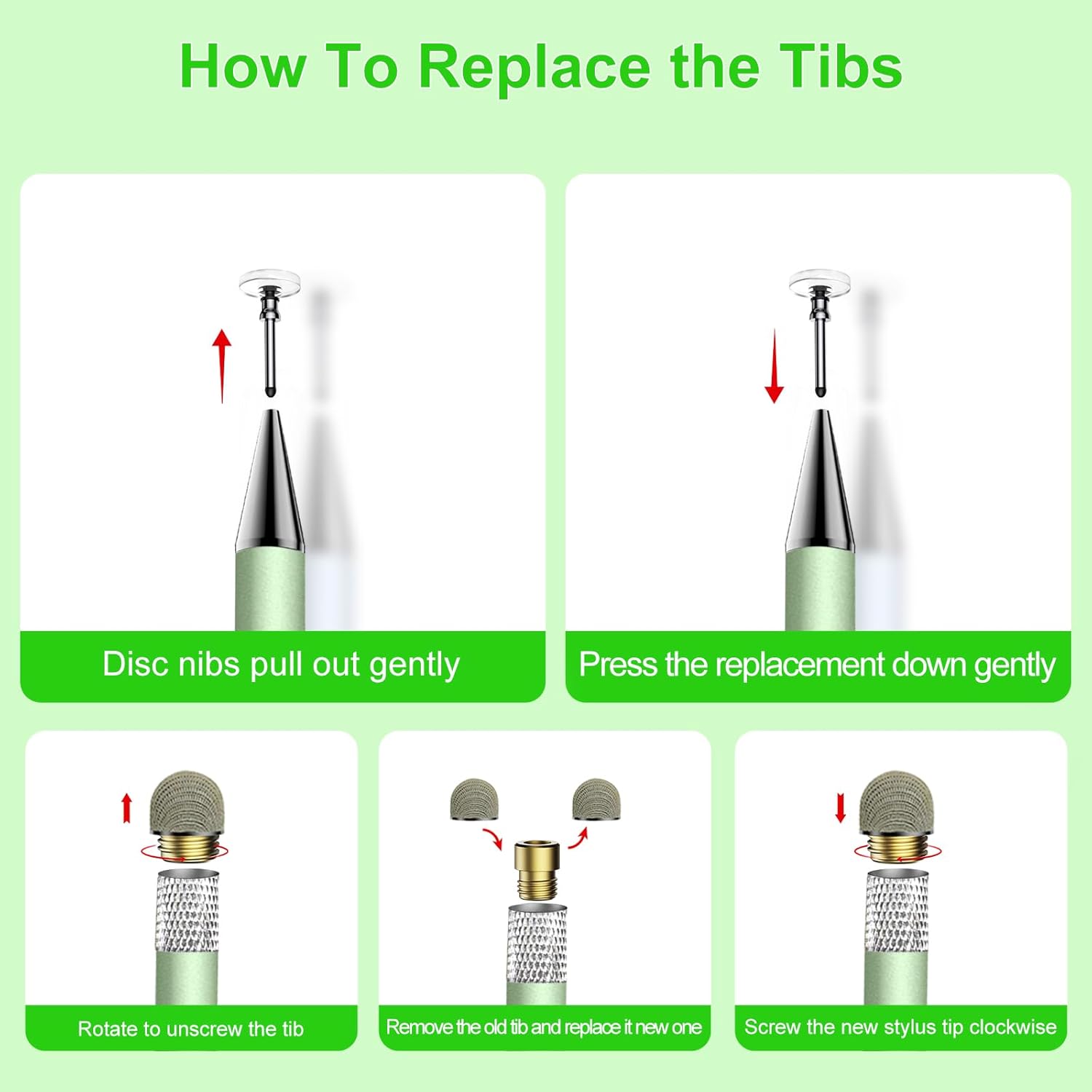 - ćAfter ServicećYou will get 3 stylus pen for touchscreen in different colors (green/rose gold/purple),stylus accessories include 2 disc nibs and 2 fiber pen caps, both ends are freely replaceable without tools, you can easily replace them by rotating the end of the fiber pen cap or pulling out the disc nib. You can share the stylus for ipad with your family and friends. When you have problems with the Zhao Cai Jin Bao stylus pen and need help, you can always contact us.