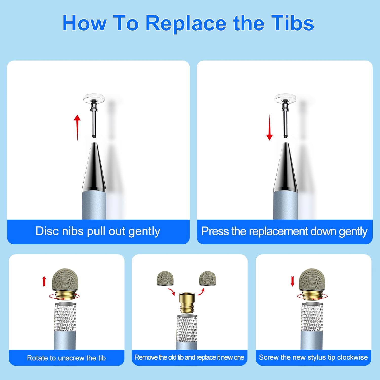 - 【After Service】You will get 3 stylus pen for touchscreen in different colors (silver/blue/gold),stylus accessories include 2 disc nibs and 2 fiber pen caps, both ends are freely replaceable without tools, you can easily replace them by rotating the end of the fiber pen cap or pulling out the disc nib. You can share the stylus for ipad with your family and friends. When you have problems with the Zhao Cai Jin Bao stylus pen and need help, you can always contact us.