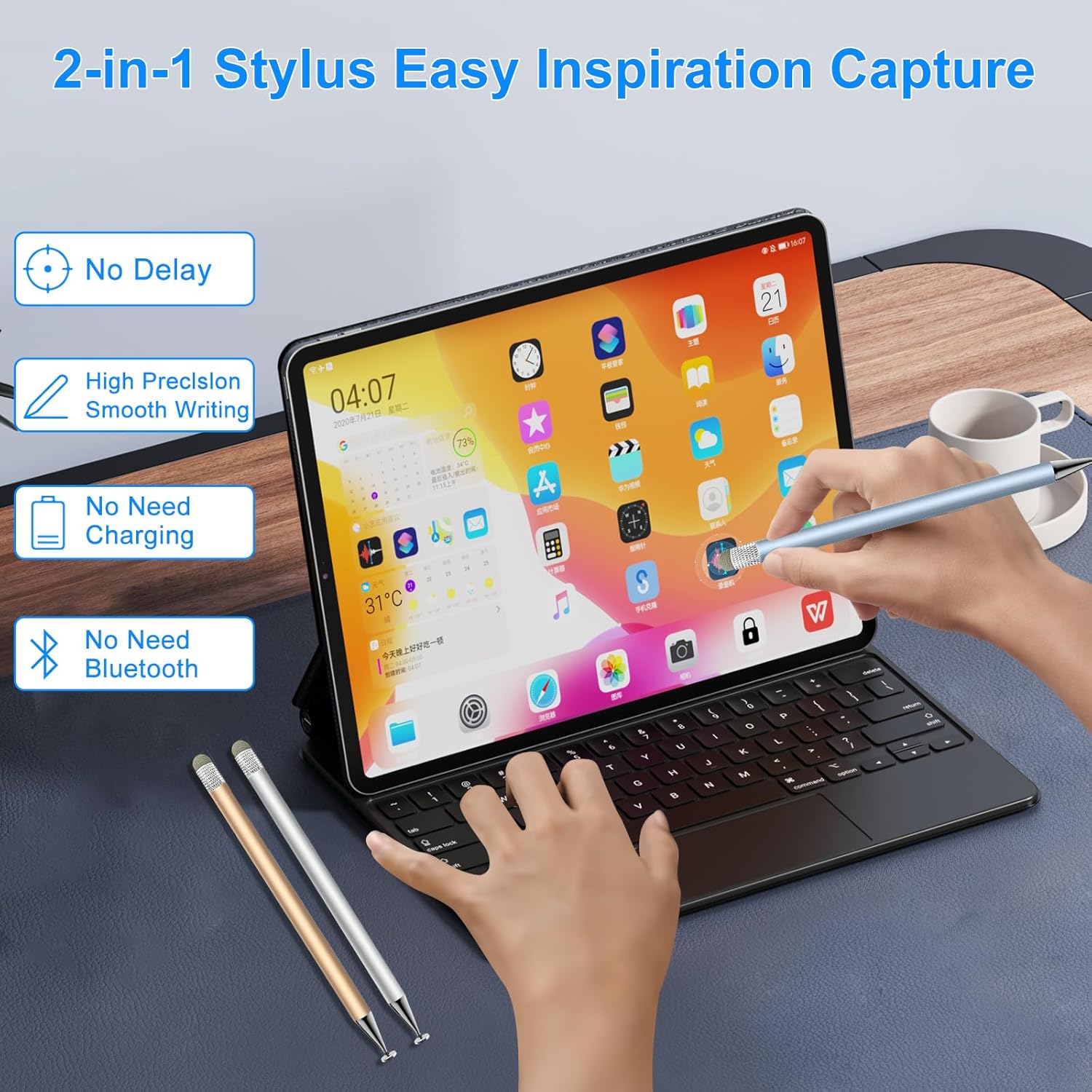 - 【2-in-1 Design Stylus】stylus pen is made of lightweight alloy, and there is no need for Bluetooth connection or charging.stylus for ipad pen has different nibs at both ends. One end is a disc nib/0.2in, which is suitable for taking notes and drawing, and the other end is a durable fiber nib/0.3in, which is used for browsing or scrolling web pages. It can be used after opening the package to meet your different needs. It feels comfortable, durable and anti-aging, making everything feel like writing on paper, and easily capturing inspiration.