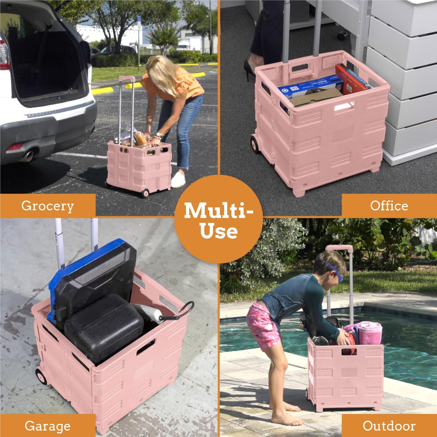Inspired Living Ultra-Slim Rolling Collapsible Storage Pack-N-Roll Utility-carts, with Telescopic Handle, for Home, Garden, Shopping, Office, School use, Medium, Raspberry Pink