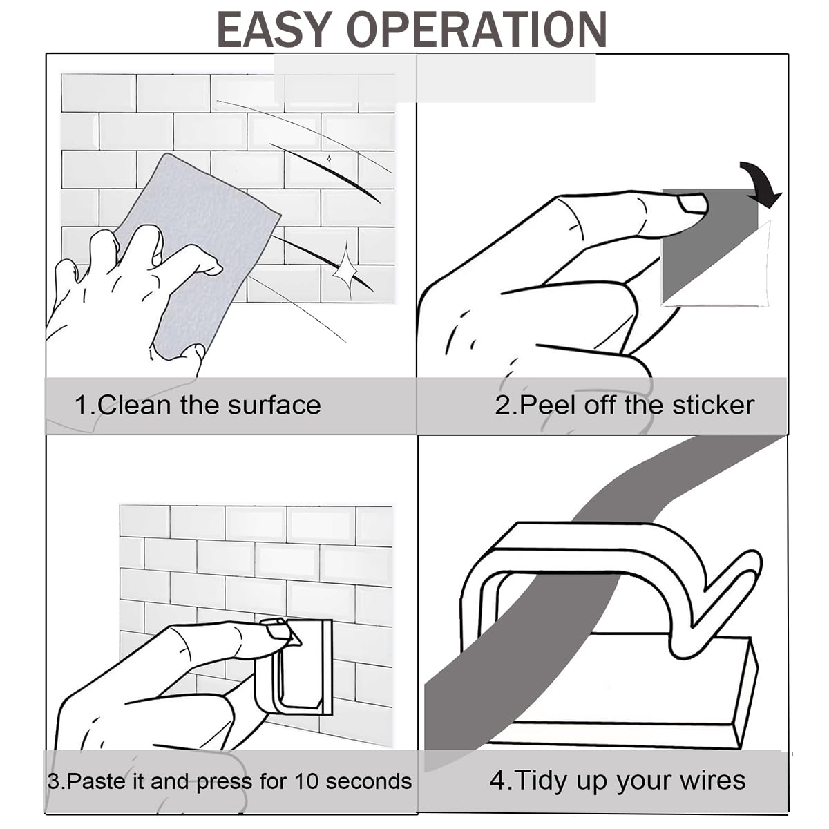 - Note Before Use: Clean the surfaces before attaching the wire clips to ensure that the mounting surfaces are free of dirt, dust, grease and wax. Stick it on and press firmly for 10 seconds, and use them after 2 hours for maximum adhesion.