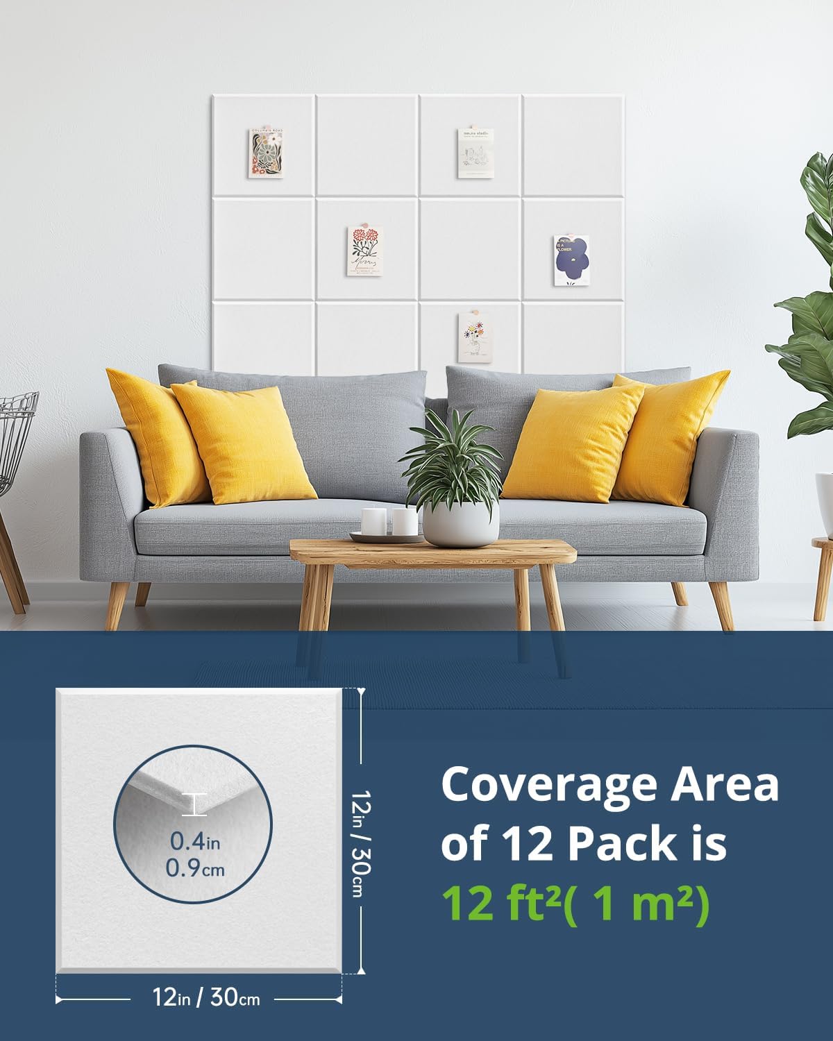 12 Pack Acoustic Panels Square Soundproof Wall Panels 12"X12"X0.4" Self-adhesive Sound Proof Panels for Walls High Density Acoustic Foam Panels for Home, Door, Office, Reccording Studio White