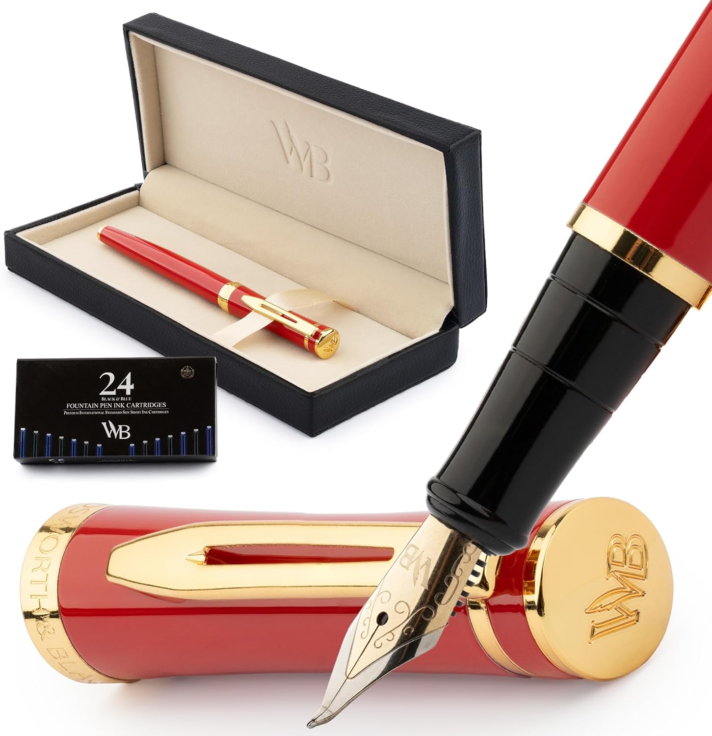 Wordsworth & Black Fountain Pen Set, Bent Nib, Includes 24 Pack Ink Cartridges, Ink Refill Converter & Gift Box, Calligraphy, [Crimson Red], Perfect for Men & Women