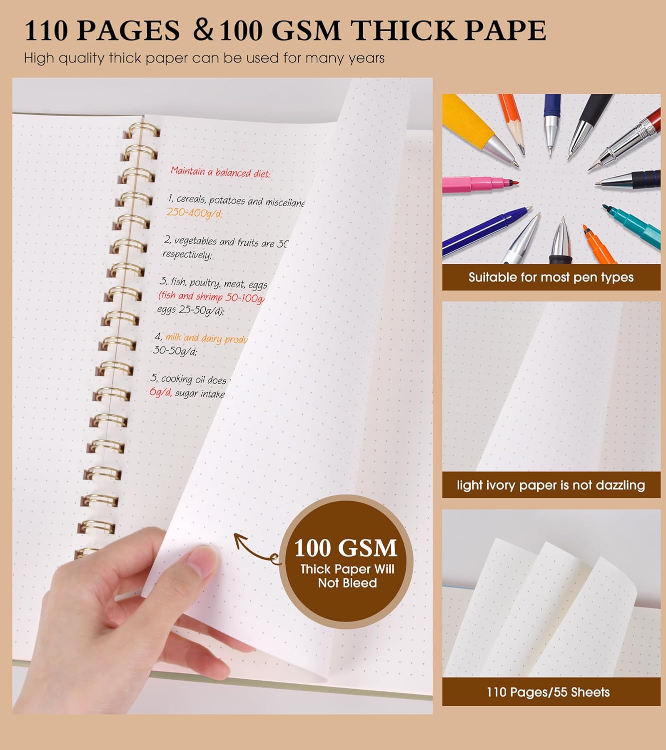 - 【Strong Spiral Metal Twin-Wire】 Our spiral dot grid journal notebook has a sturdy gold-color double wire spiral with easy-to-turn pages and keeps pages attached reliably, while still staying flat when opened, which reading more convenient and taking notes more efficient. Spiral dotted notebook easy to tear-off and fold over, as well as flip the cover back, giving you a better writing experience. Golden spiral bound adds aesthetic matching, it’s the perfect big notebook for journaling.