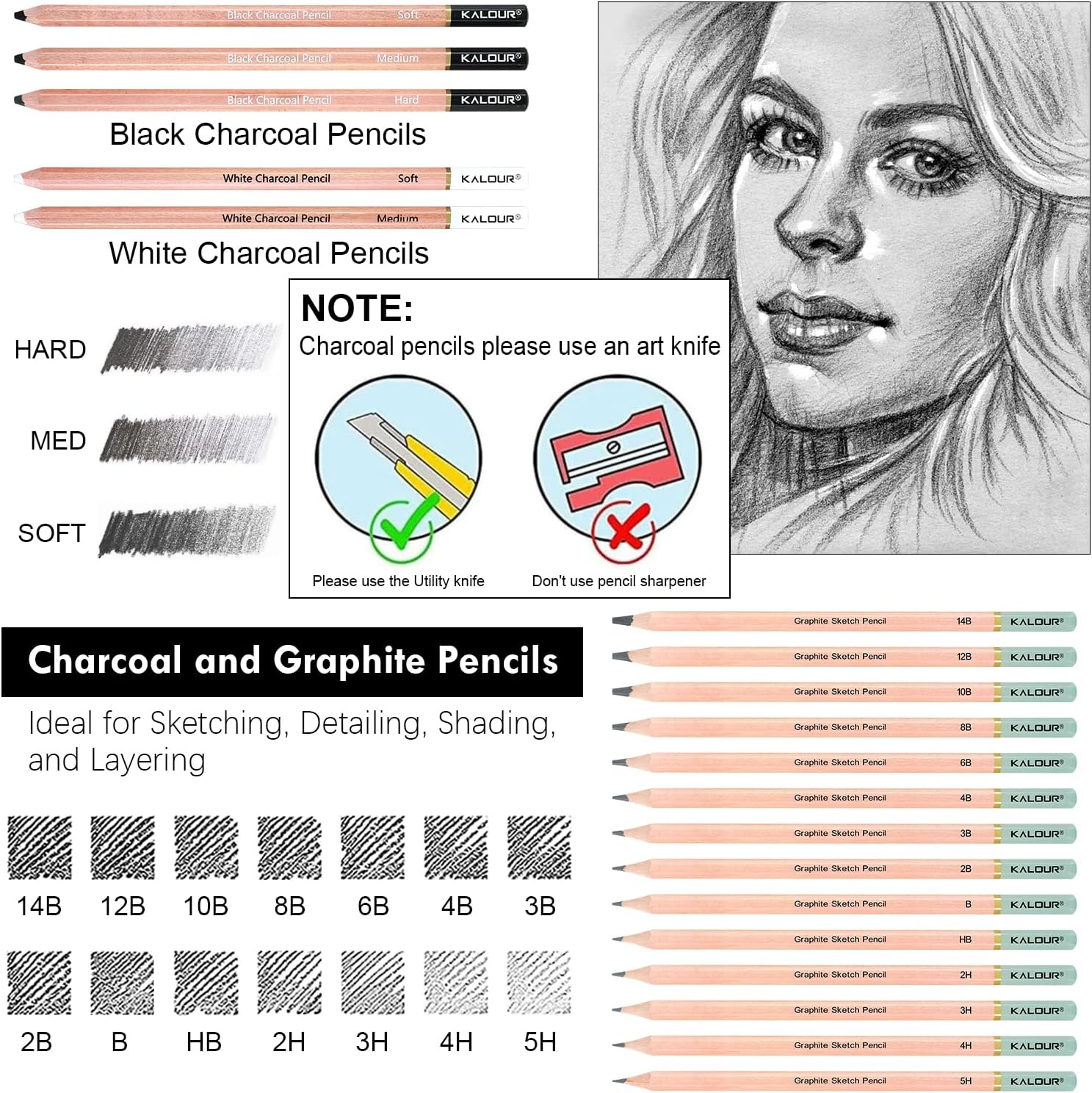 - Professional Sketch Pencils: Features smooth, uniform graphite pencils (5H, 4H, 3H, 2H, HB, B, 2B, 3B, 4B, 6B, 8B, 10B, 12B, 14B), 3 charcoal pencils (soft, medium, hard), and 2 white charcoal pencils. Non-toxic and eco-friendly. Great for adding depth and dimension to your drawings.
