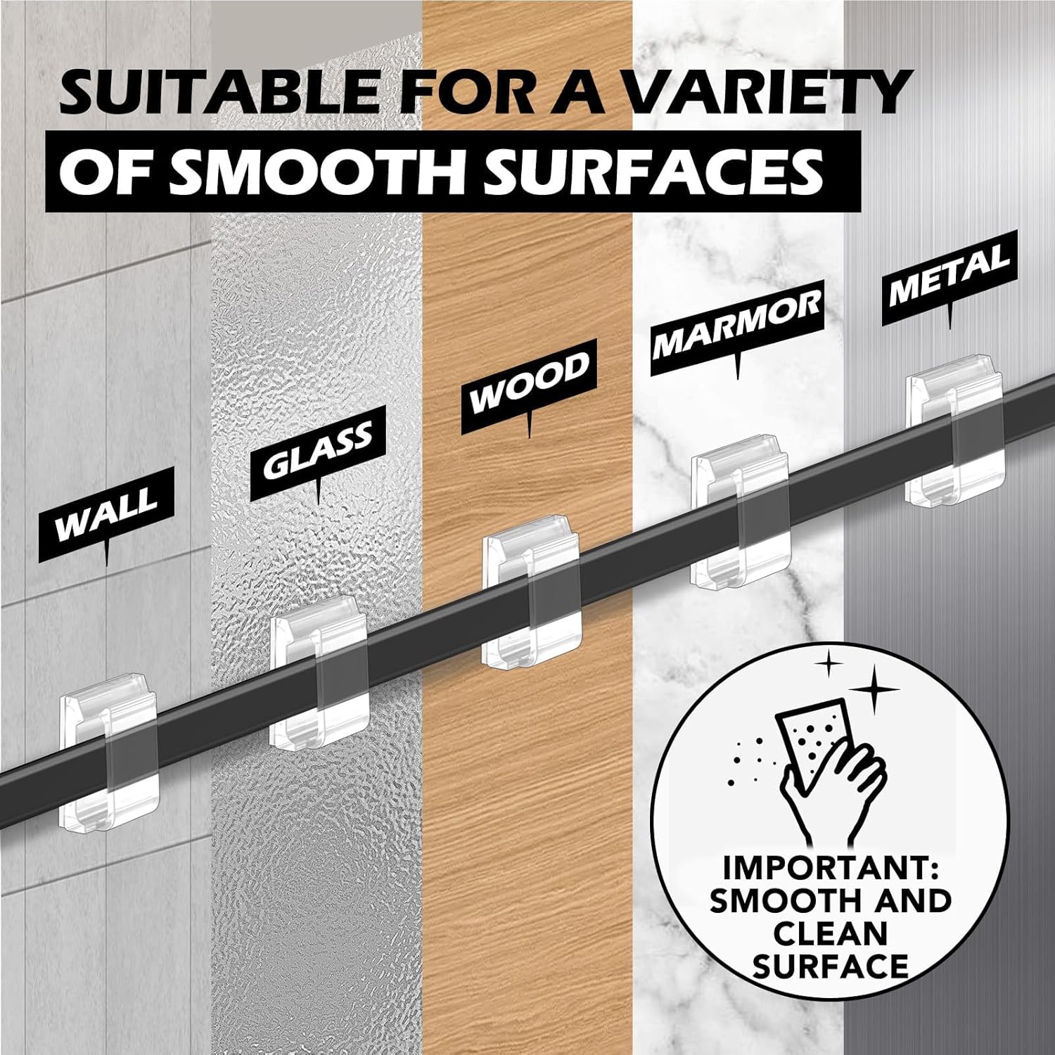 - 【NOTE】 A clean assembly surface is necessary. No dirt, dust, fat or wax. Please do not introduce the cable immediately after the cable clips have been glued to the surface. The double-sided adhesive pad reaches the strongest liability after 24 hours. You can heat the strip with a hair dryer before use