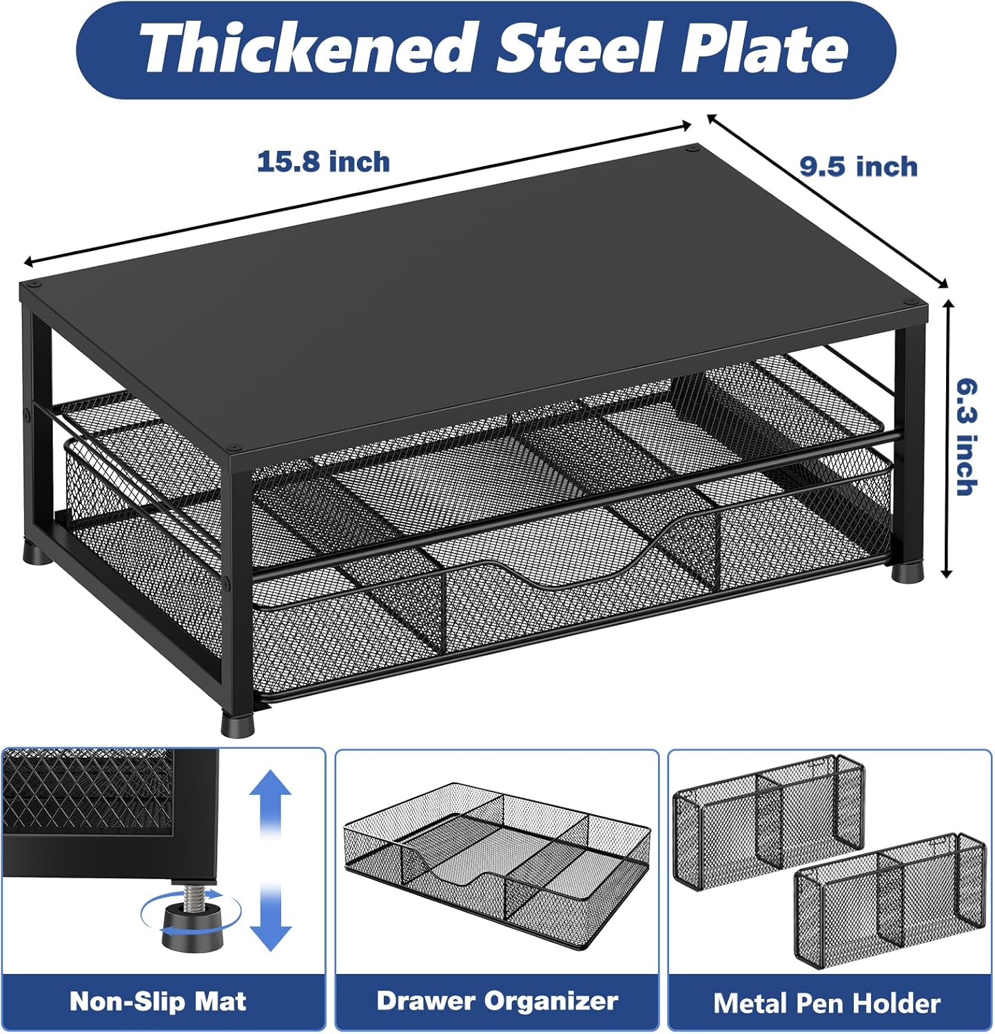 - 【Save Space】:This 2-Tier monitor stand with drawer and 2 hanging pen holders provides ample storage space to keep your office supplies and office desk accessories neatly organized and easily accessible, keeping your workspace tidy and improving your sense of well-being
