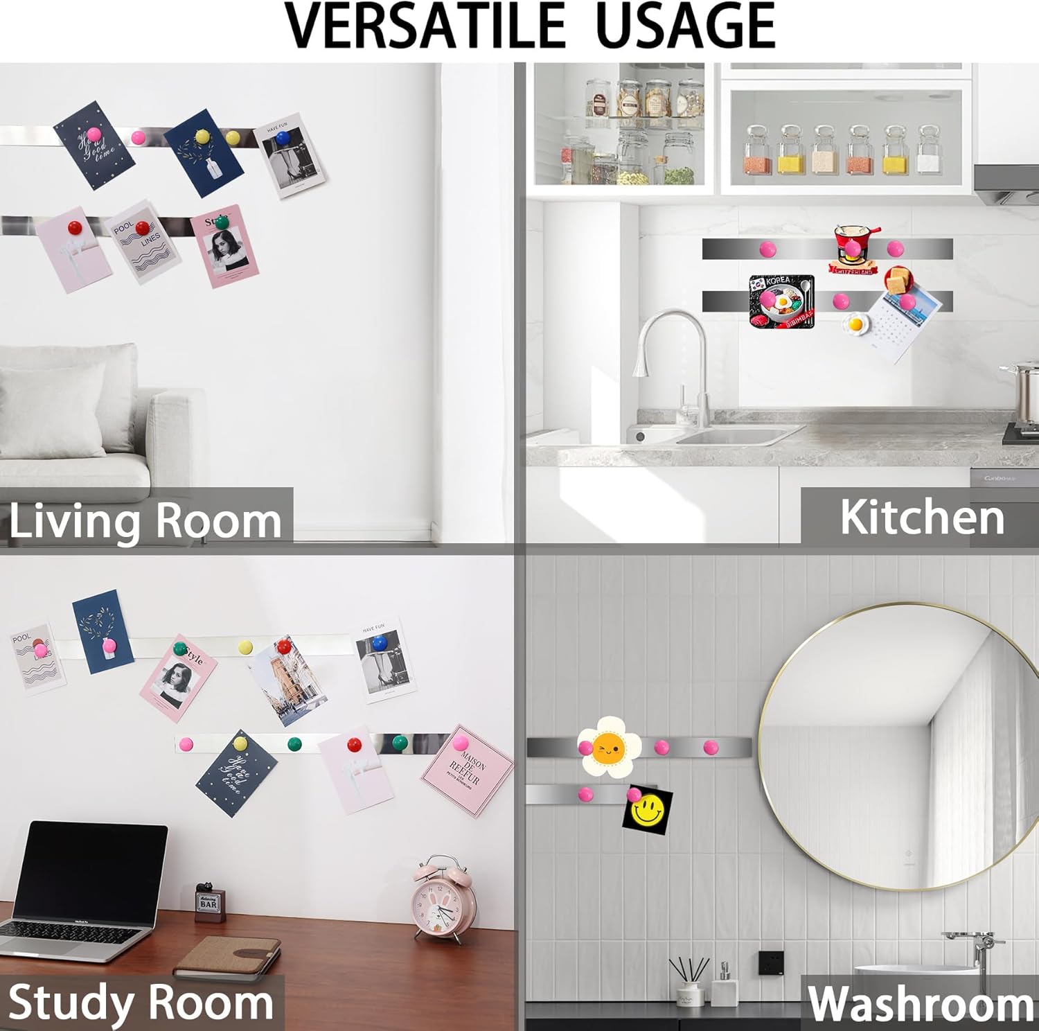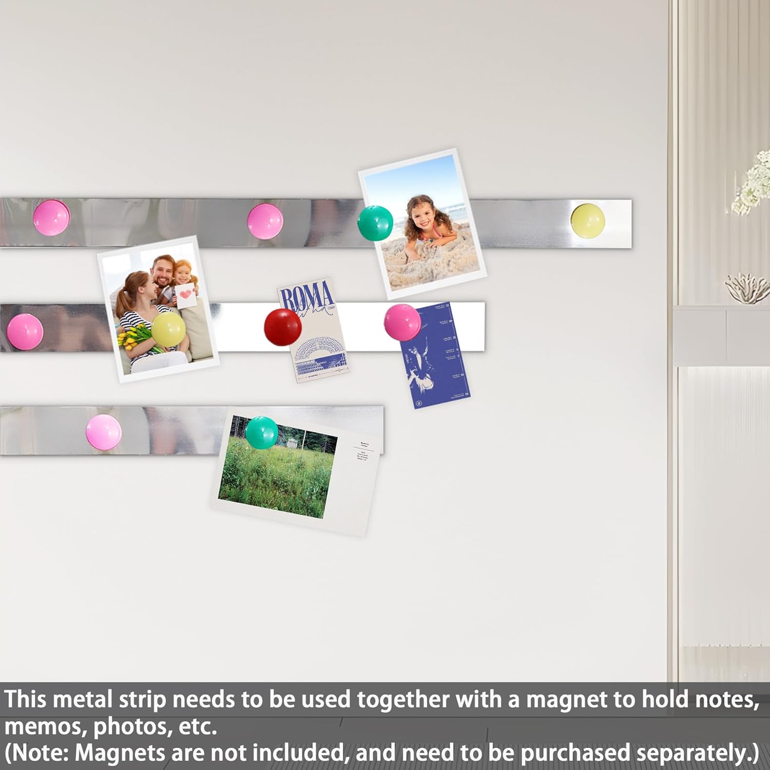 - Easy to Use: Just cut, peel and stick, simple operation is easy to get started. Then you can use a dot magnet and stick the memos or notes to the metal strip for easy viewing and use. This allows labels to be attached to non metallic surfaces, likes the wall