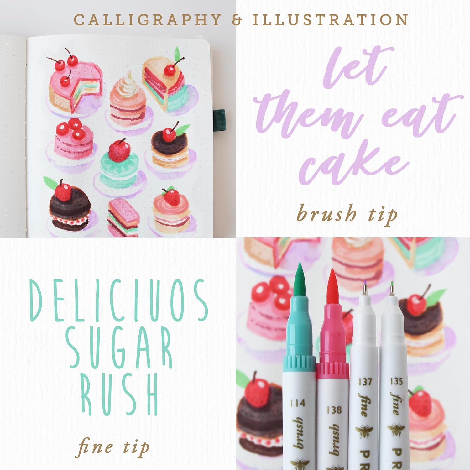 Primrosia 12 Dual Tip Watercolor Marker Pens - Fine Tip & Brush Tips, Professional Quality, 4 x Sticker Sheets, Blendable, Non-Toxic, Perfect for Calligraphy, Drawing & Coloring. (Patisserie)
